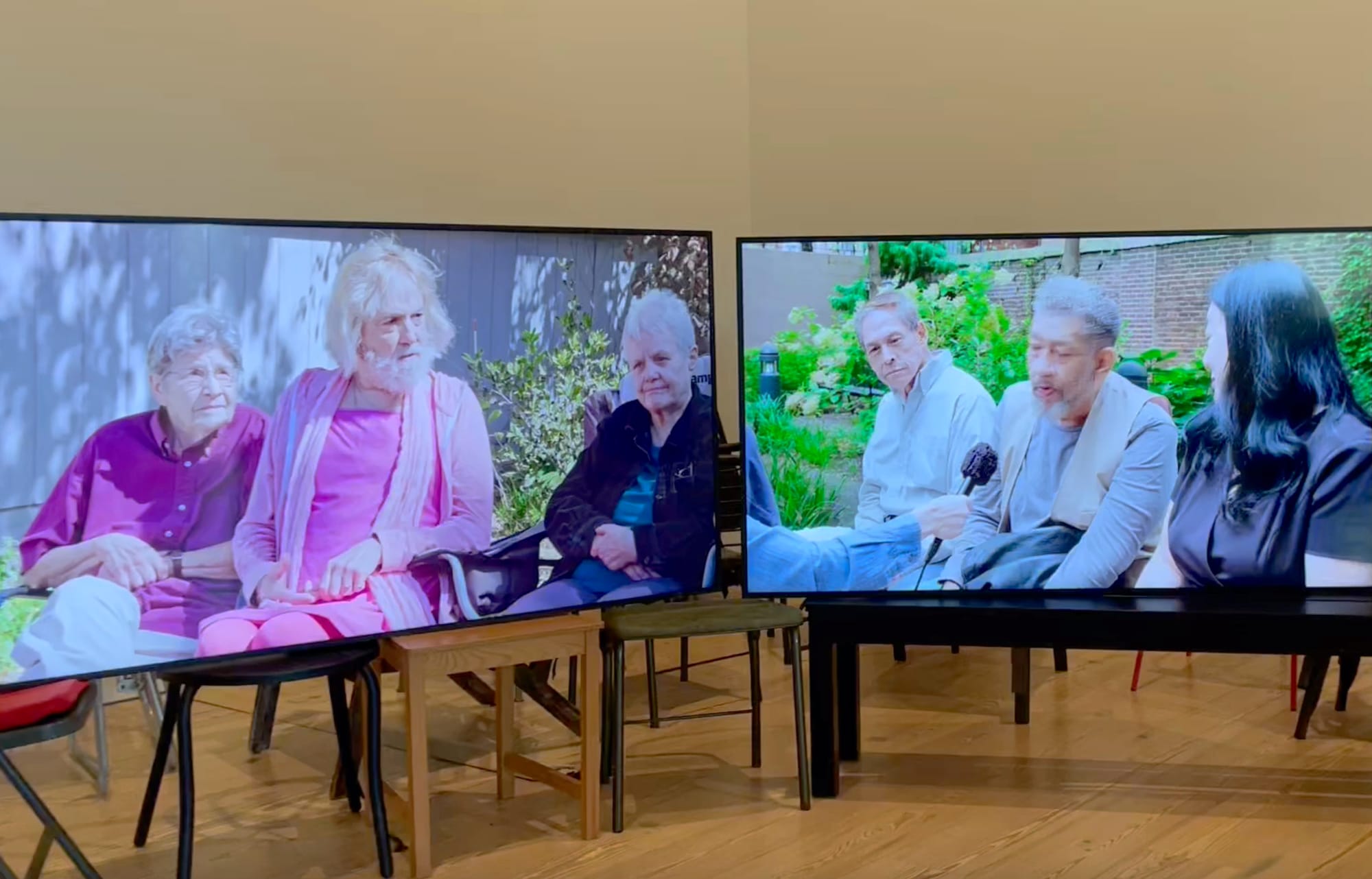 For me, an immediate standout was Sharon Hayes’s two-channel video Ricerche: four (2024). Even without watching the full 80 minutes, the documentary — the last in a series of works addressing gender and sexuality — should be illuminating for any audience members, whether queer or straight. The artist establishes an almost familial tone as her interview subjects sit in a group and converse (a configuration echoed by the mismatched chairs set up around the monitors), yet the subject matter is anything but casual. A diverse group of queer and genderqueer people offer intimate observations on their fears, frustrations, and the disparity between the ideals and realities of life as an LGBTQ+ person — the discrimination that comes from without and within. Hayes avoids didacticism by making a space for individual stories. The videos can be hard to hear in a busy gallery, so subtitles would be helpful, as the work is worth a watch. — Natalie Haddad