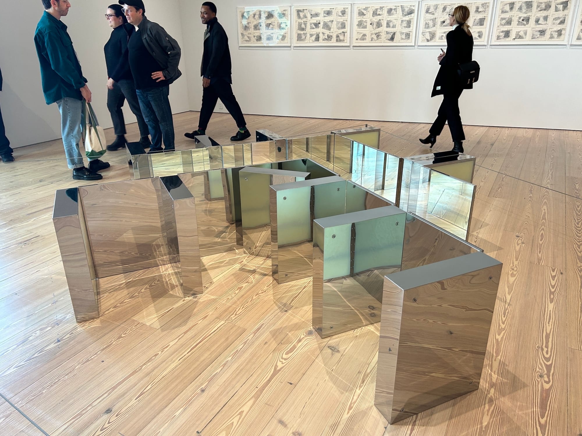 My love for this ladder-like floor piece constructed of mirrored medicine cabinets was only made stronger by the realization — thanks to my overhearing a curatorial assistant’s conversation in passing — that the storage sections of the structures are filled with Vaseline. The surfaces take on a yellowish hue that is at once sickly and sleek, a perfect representation of the many tensions and contradictions of having and managing a human body. Lazard’s work is informed by their personal experience of chronic illness and imbued with a sense of endlessness and the labyrinthine.