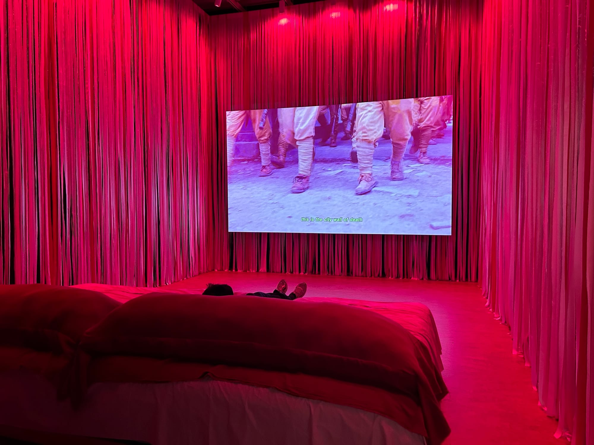 Step into a lusciously curtained room drenched in fuchsia light on the sixth floor and you’ll find plush, comfy bedding where you can plop down and watch Severin Nguyen’s entrancing 67-minute video. The piece portrays Iris, an actress rehearsing for a role in a film about the 1937 massacre of Chinese civilians in Nanjing, and is shot largely in the Hengdian World Studios in Zhejiang Province — the massive film studio whose productions have been criticized for sanitizing China's history. I love it when videos are presented in thoughtful settings that activate and enhance the works, and experiencing "In Her Time (Iris’s Version)" in this uncanny pink universe immersed me in its subject matter in a more profound way than a more conventional display would. — VD