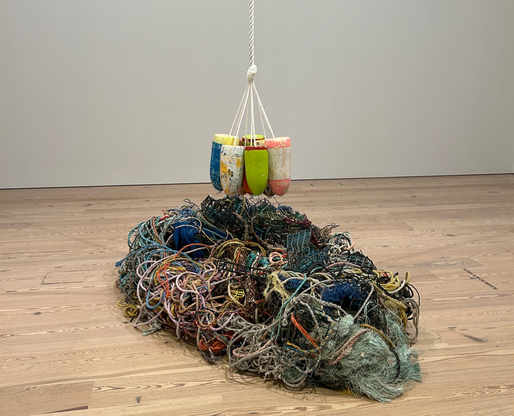 I am not itching to negatively review any artwork that attempts to address something as serious and urgent as migratory disaster and displacement, especially in a Biennial with so few references to global crises. And Trinidad-born Olivier, whose oeuvre includes thought-provoking works reimagining the oppressive logic of monuments, knows a thing or two about engaging audiences with public art. But this heap of tangled ropes, buoys, and other ocean detritus conjures little more than the all-too-general idea of something washed up on the shore; a more specific picture never comes into relief. The most successful aspect of the installation is the dangling rope, which the artist has cast in salt in a reference to the practice of bartering salt in exchange for enslaved people in Ancient Greece, but it's easy to miss this detail given the vagueness of the rest. — VD