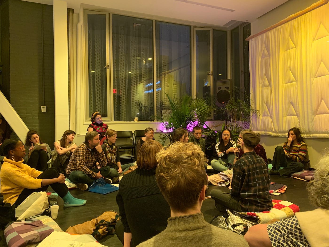 Dozens of people gathered around the trio of First Nations artists and scholars facilitating the second of three KIN Conversations at the Performance Space New York in the East Village. Sittings on folded quilt blankets, participants occasionally left the crowded circle for food and beverages. Incense was burned, and the crowd eventually settled into an evening of discussion about the weight of trauma.