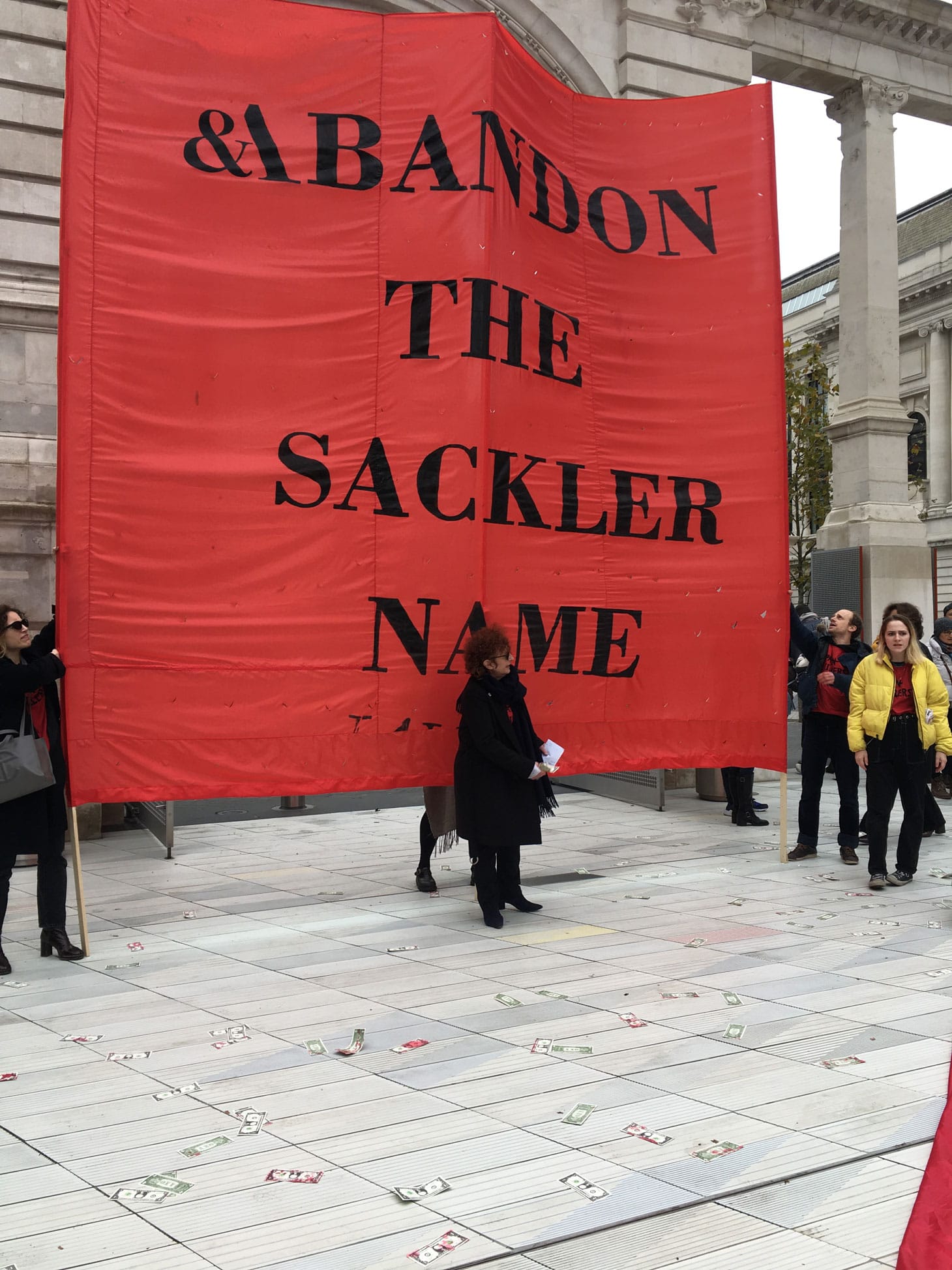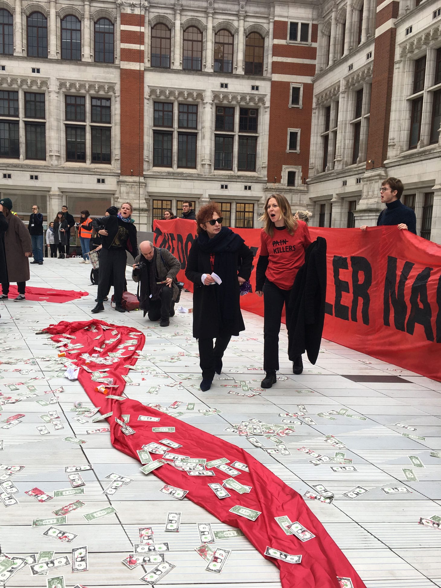 The core Sackler family members have an estimated collective worth of $14 billion, partly derived from the $35 billion which Purdue Pharma has made in sales revenue from OxyContin. In 2007, executives of the company pled guilty to the charge that they marketed OxyContin “with intent to defraud or mislead” regulators. Purdue Pharma and eight members of the family are currently being sued by thousands of American cities, counties, and states for a host of other charges. Earlier this year the company filed for bankruptcy, bringing a halt to the lawsuits. (Outside of the bankruptcy hearing in New York, PAIN showered the steps of the courthouse with “blood money.”)