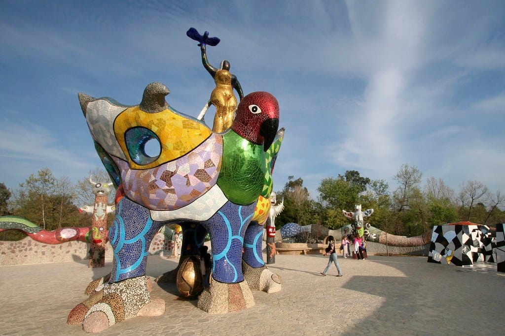 Although French artist Niki de Saint Phalle established herself in the early 1960s by shooting canvases filled with bags of paint — a sensational combination of performative violence and action painting — she would spend most of her career as a sculptor, creating brightly colored, boisterous female figures. These ranged from life-sized to monumental, including several public artworks. Her only sculpture garden in the US is 2003’s “Queen Califia’s Magic Circle” in Escondido’s Kit Carson Park. Inspired by the mythical ruler of California, Queen Califia, the mosaic work is rimmed by a large snake wall and features nine sculptures based on Native American, Mexican, and Pre-Columbian imagery.