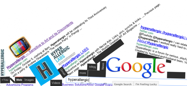 Art and technology collective Future Archaeology has taken the mirror concept further with “Moc.Elgoog”. This work was only realized briefly as a site specific rendition of Google that was available only to those viewers around Splatterpool Artspace in Brooklyn, NY during its showing. “Moc.Elgoog” not only flips the browser, but also inverts the search results, putting least relevant content at the top of the search engine. Probably not very useful as a tool (I would hate to see activists avoiding firewalls stoop to this level), the piece calls into question how value is determined and solidified by Google’s search algorithms. What important content are we missing by only looking at the first page of search results? How and who decided those results are the most important? These are important questions to ask as advertising companies seem to have the largest influence on Google and social media websites like Facebook and Twitter.