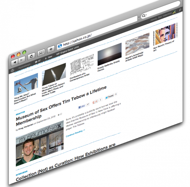 Of course, it’s not just the artists who have their hands in the mix. Facebook, Tumblr, Twitter, and other sites are probably changing our browsing habits more than anything else. As more and more of us get our news from and share our own content through those social sites, how we move through the web has become an increasingly monolithic experience. I wake up daily and go through hundreds of images on my Tumblr, only wandering out of my dashboard if an image is engaging enough. I get much of my news from Facebook friends. Not only have I not owned a television or a had newspaper subscription for the past few years, I increasingly bypass online news sources, instead favoring recommendations I get from friends. As we’re increasingly stuck in our browsing habits, we need art sites like these to shake us out of our internet-induced stupor.