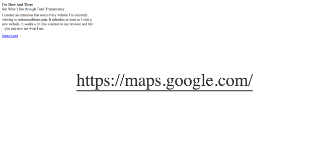 In a much more singular look at browsing habits, “I’m Here and There” is a 2011 work by Jonas Lund which allows one to watch, and if they choose, mimic the browsing habits of the artist in real time. The website simply displays the url that the artist is currently looking at, which is updated whenever the artist wanders to a new website. This provocative transparency is an aspect of browsing most of us do not want to embrace, and Lund’s commitment to it through this ongoing work is commendable in both its ideology and dedication.