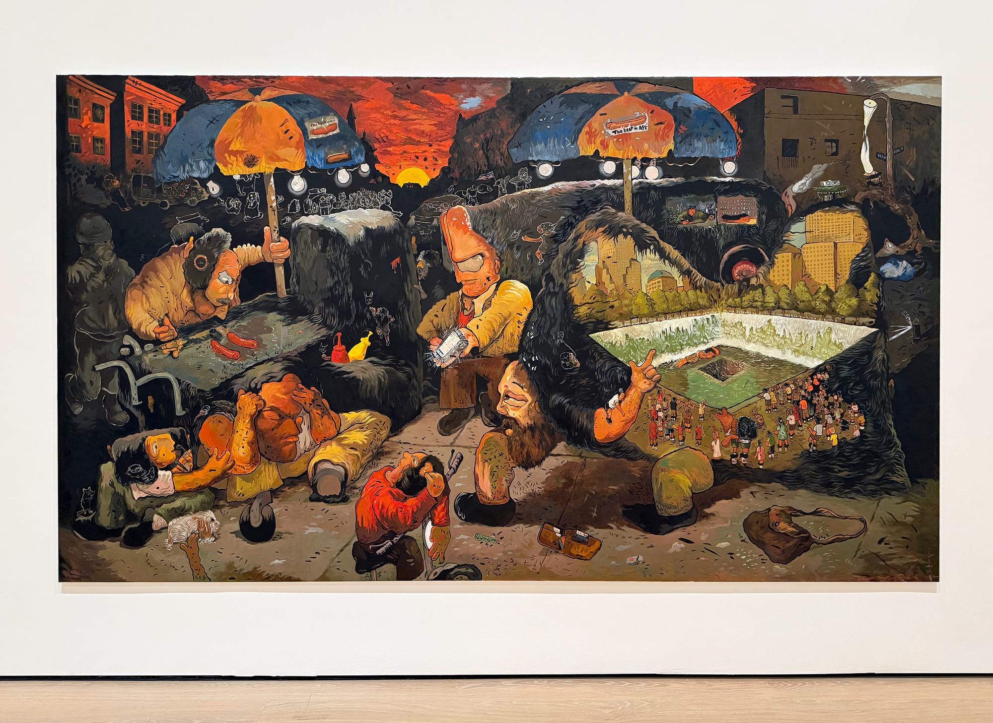 Ali Eyal grew up in Baghdad during the American occupation of Iraq, and his paintings reflect the loss he experienced and his attempts to reckon with the aftermath. His large-scale canvases are often based on his personal experiences, but rendered as dream-like visions through his fantastical, figurative style. “And Look Where I Went” (2025) is based on his visit to the 9/11 Memorial in downtown New York last year — a site he had tried to avoid because of the profound despair embedded there. Nearby, he had a conversation with an Egyptian hot dog vendor who had recently immigrated to the US. Gazing into the void of the waterfalls, Eyal "became like a kid again,” he recalled, reliving the violence of the war and sectarian conflicts that followed. “It’s still happening, it’s ongoing,” he said.