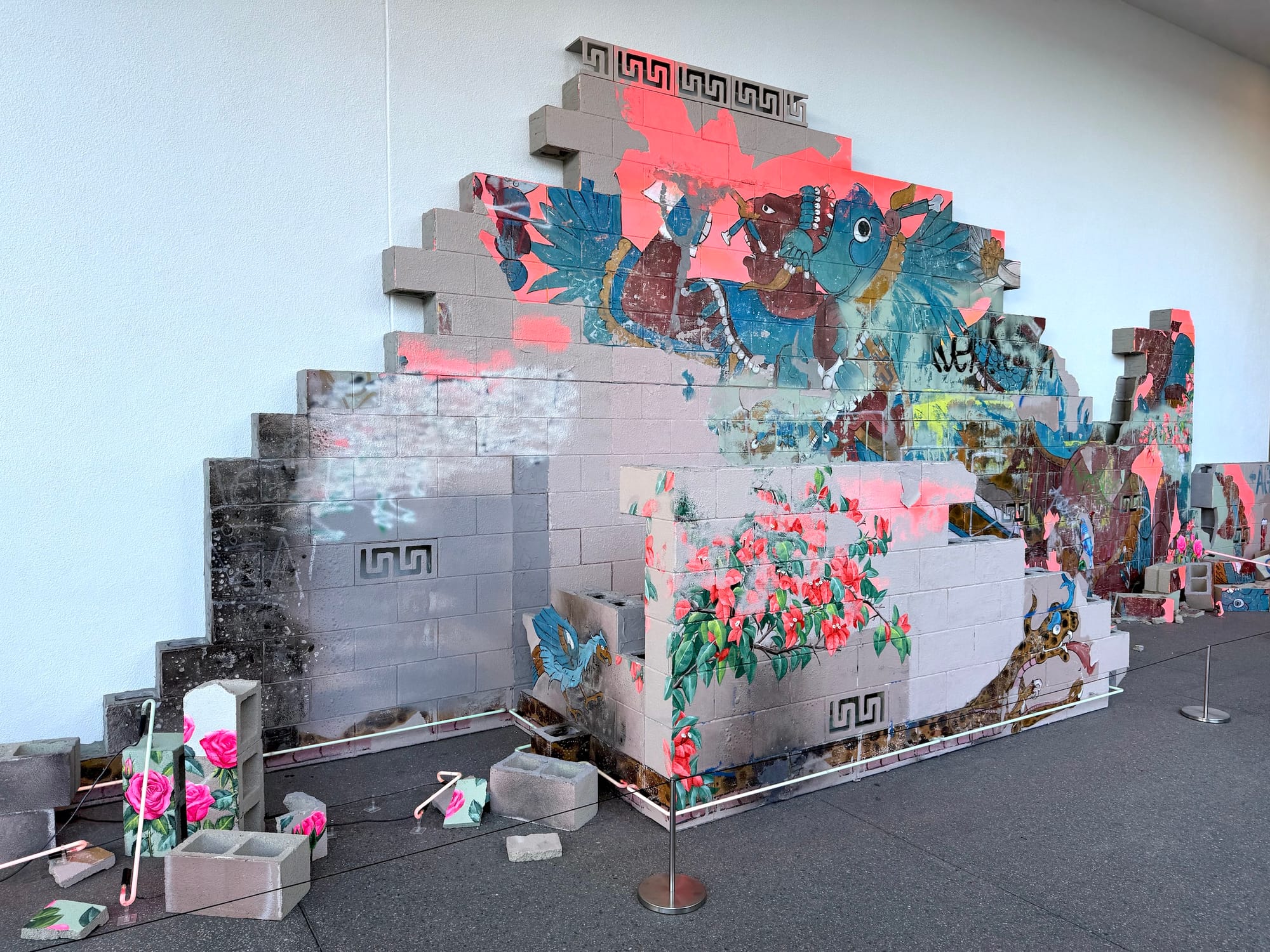The physical landscape of Los Angeles also provides inspiration for Patrick Martinez, whose large-scale sculptural painting “Battle of the City on Fire” (2025) pulls from the city’s vernacular architecture, signage, and murals. The 70-foot long construction resembles a crumbling cinder-block wall, onto which Martinez has painted layers of history. The main image references a battle mural at Cacaxtla, an archaeological site in Mexico, linking LA’s rich mural culture with murals created hundreds of years ago elsewhere in the Americas. He imagines the brown-skinned warriors as the ancestors of the city's Mexican and Central American communities, and draws parallels to LA’s current brutal immigration raids. “While I was making this work, in the world right outside, people were being disappeared and kidnapped, families being erased,” he said.