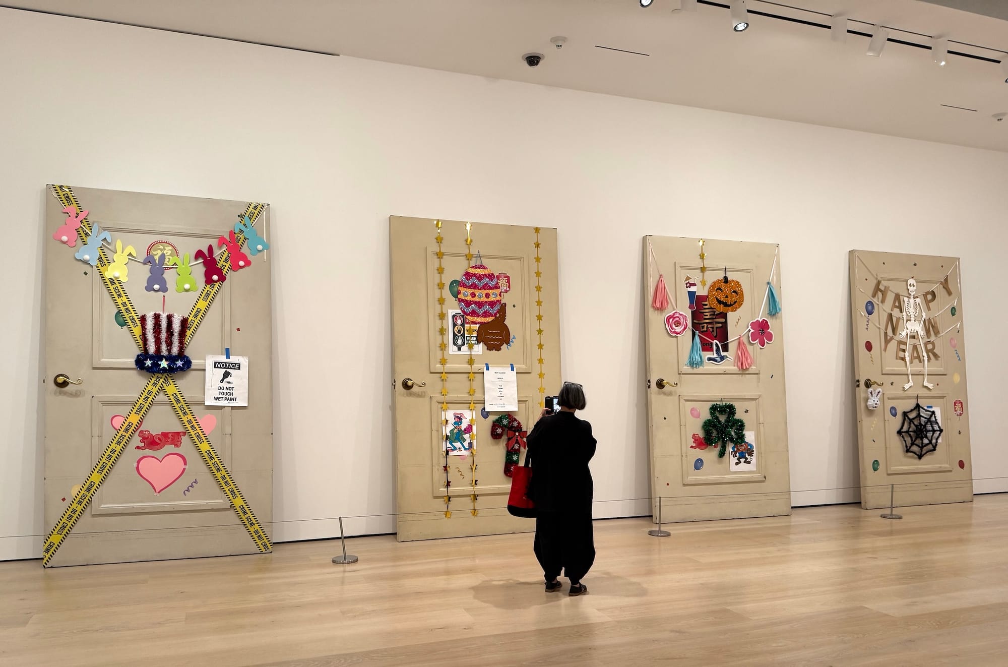 Amanda Ross-Ho’s “Untitled Thresholds (FOUR SEASONS)” (2025) also stems from personal narrative, but is made accessible through decontextualization. The work consists of four monumental doors, replicas of the entrances to her father’s room at the residential nursing home where he lives. Ross-Ho scaled the doors up by 170%, meticulously recreating years of scratches, dings, and paint touch-ups. Each one is covered by various seasonal decorations commonly used in institutional settings to bring a dash of cheer and mark the days. Ross-Ho has enlarged these tinsel totems as well, aided by her experience as a prop fabricator, arranging them out of sync, “intentionally corrupting” any impression of linear progression.