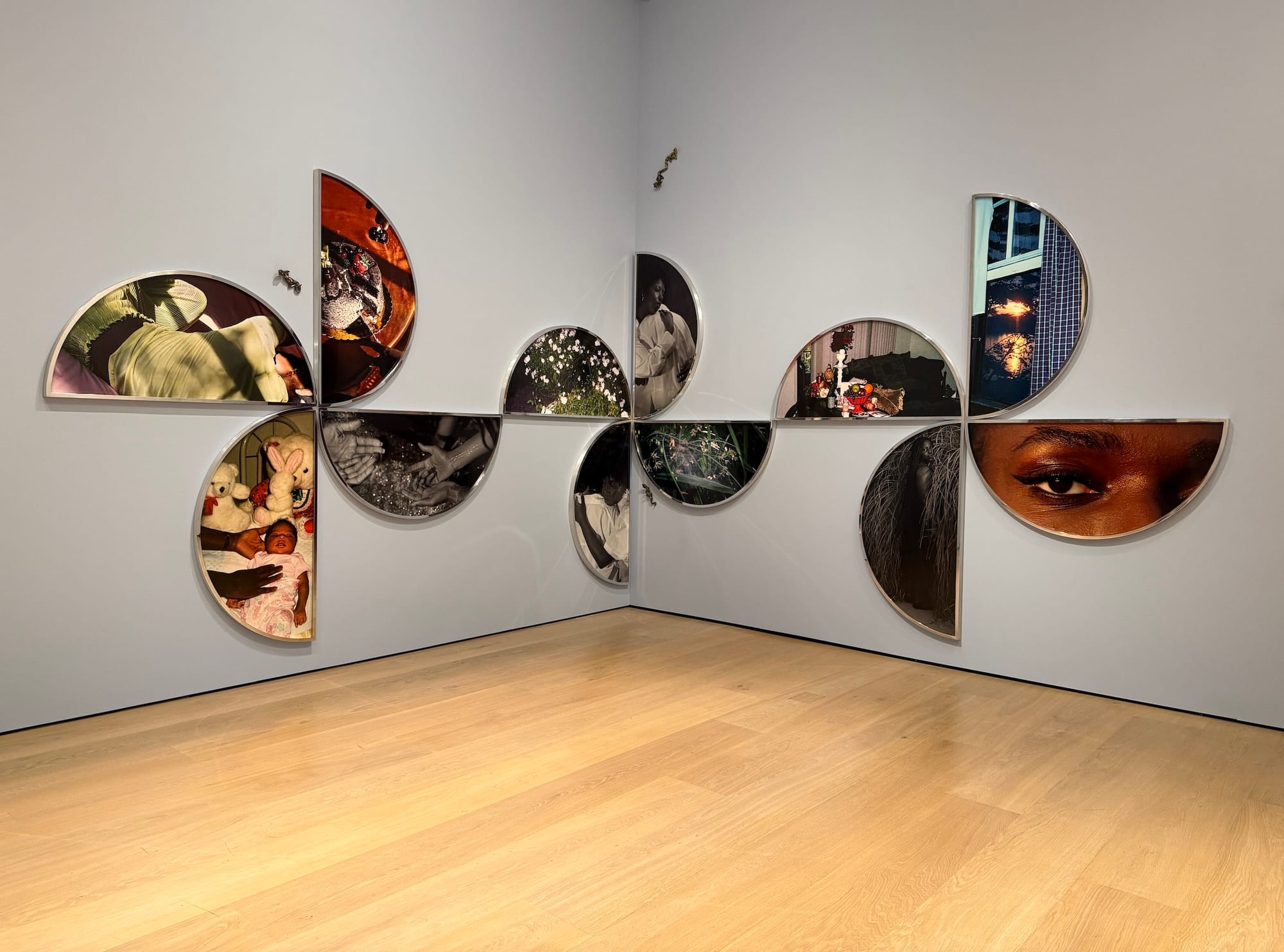 Widline Cadet juxtaposes carefully composed portraits with archival family snapshots, placing them in shaped frames as part of larger installations. Born in Haiti, Cadet moved to the US as a child, and her fractured visions reference a sense of diasporic connection, bits and pieces of memories given equal weight as professionally staged photos. "I'm thinking about all the ways you measure life," she told Hyperallergic. “Shifting Skies” (2025) is composed of 12 images in half-circle shaped frames, arranged in a design that resembles a pinwheel, or the pattern of breeze blocks, the perforated building blocks common to both Southern California and Haiti. This physical link, along with the region's flora and warm weather, provided a sense of familiarity when Cadet moved to LA from New York three years ago. “I’ve never lived in a place that’s reminded me of my home country as much,” she said.