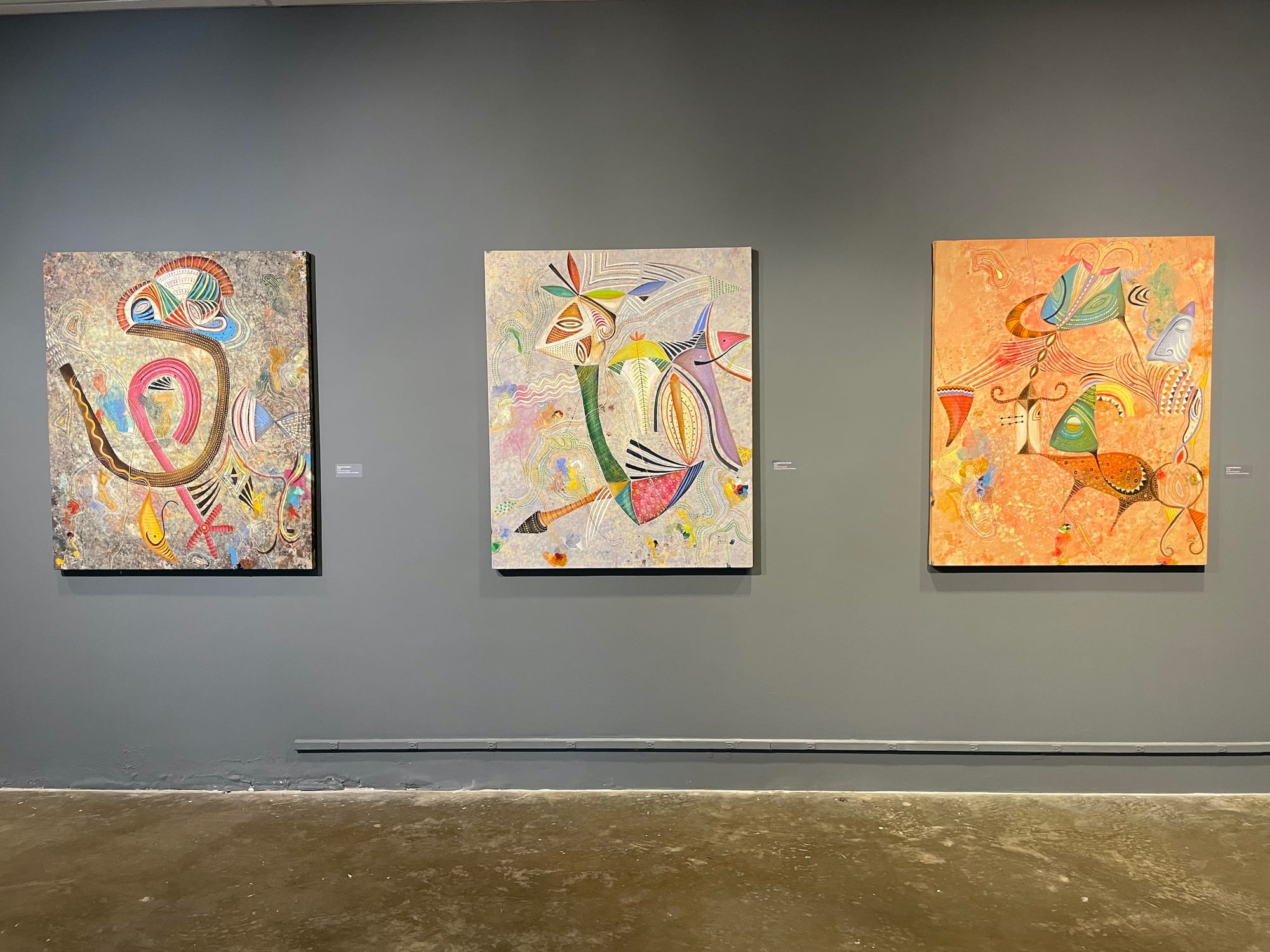 For his first United States museum exhibition, Ivorian artist Ange Martial Méné presents acrylic works that visualize the spiritual. Inspired by sources ranging from ancient cave paintings to Surrealism, Méné invites viewers on a psychedelic journey marked by his intuitive process and symbolic imagery. My favorite work on display, "Genesis," features green and blue abstract forms mirroring the marine world, like surreal cephalopods and manta rays, alongside an angular human figure. As the exhibition catalog explains, “the work evokes a sense of origins, conjuring the essential role of nature in the birth of the universe.”