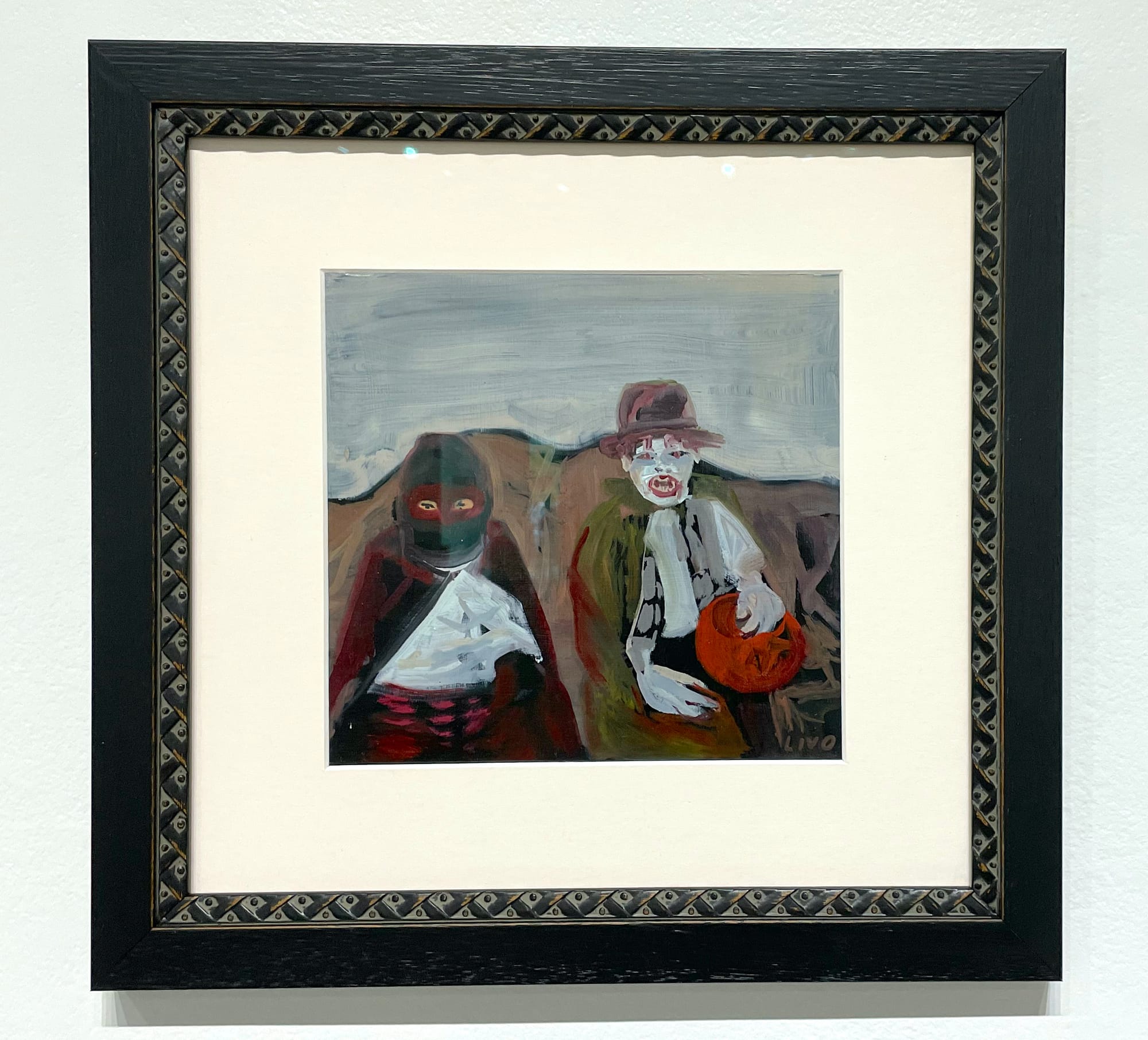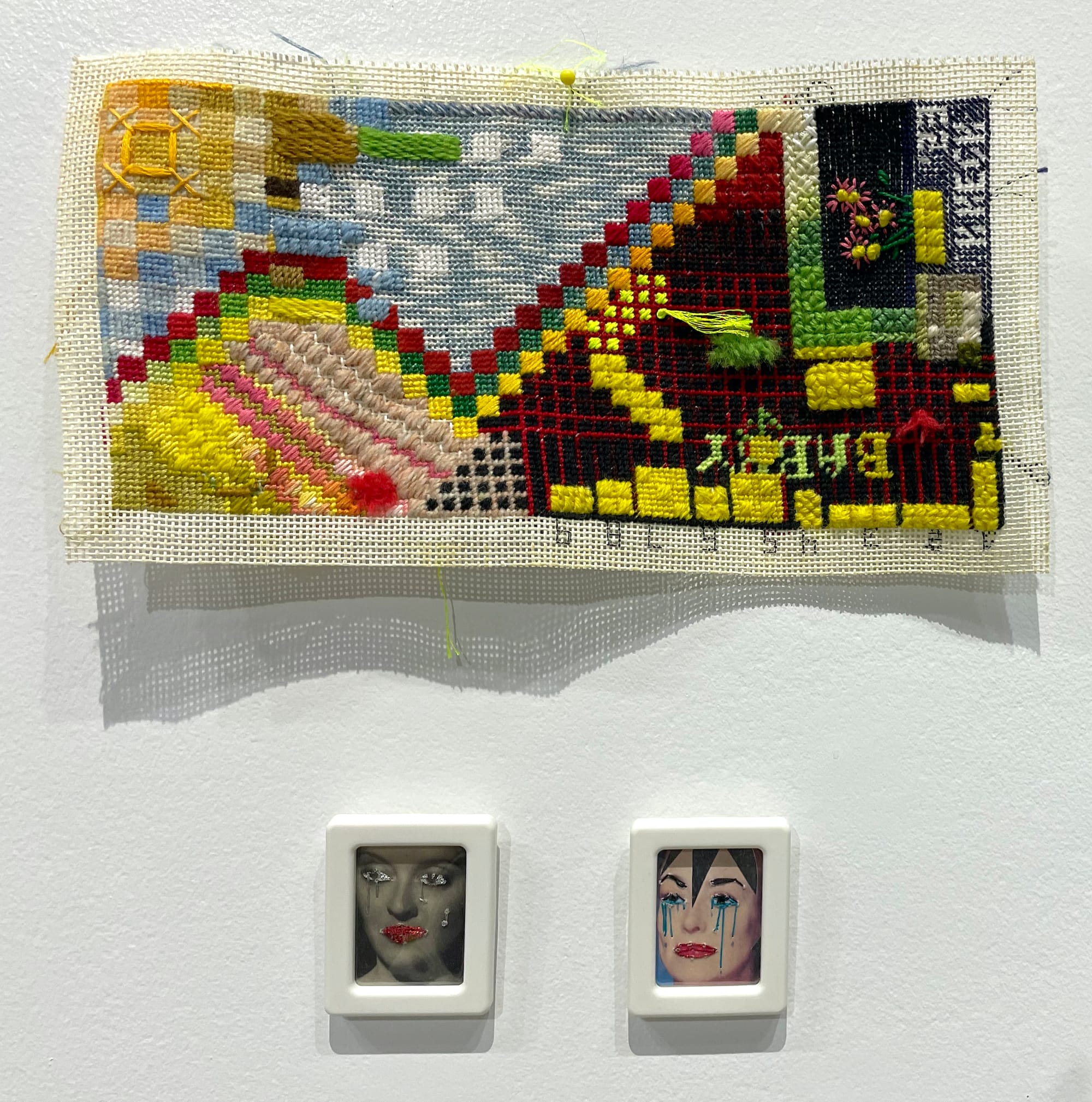 Twenty years ago, the Detroit Artists Market hosted a show juried by Mike Kelley that leaned toward a brooding heavy metal aesthetic. Although most people know Kelley as a Los Angeles artist, the Detroit native’s roots were clear in the tone of that show: There’s something gloomy and weird about growing up in this place, but it’s resulted in an original, visceral, and sometimes awesomely oddball art and music underground. Tom Livo’s small, strangely endearing painting of little villains, “Halloween ’71” (2023), brought me back to that state of mind, while John Criscitello’s tiny portraits of Hollywood glamour gone wrong (displayed beneath a vibrant multicolored embroidery by Kira Keck) recalled the trash-glam style of Kelley’s early Ann Arbor-based band/art collective Destroy All Monsters.