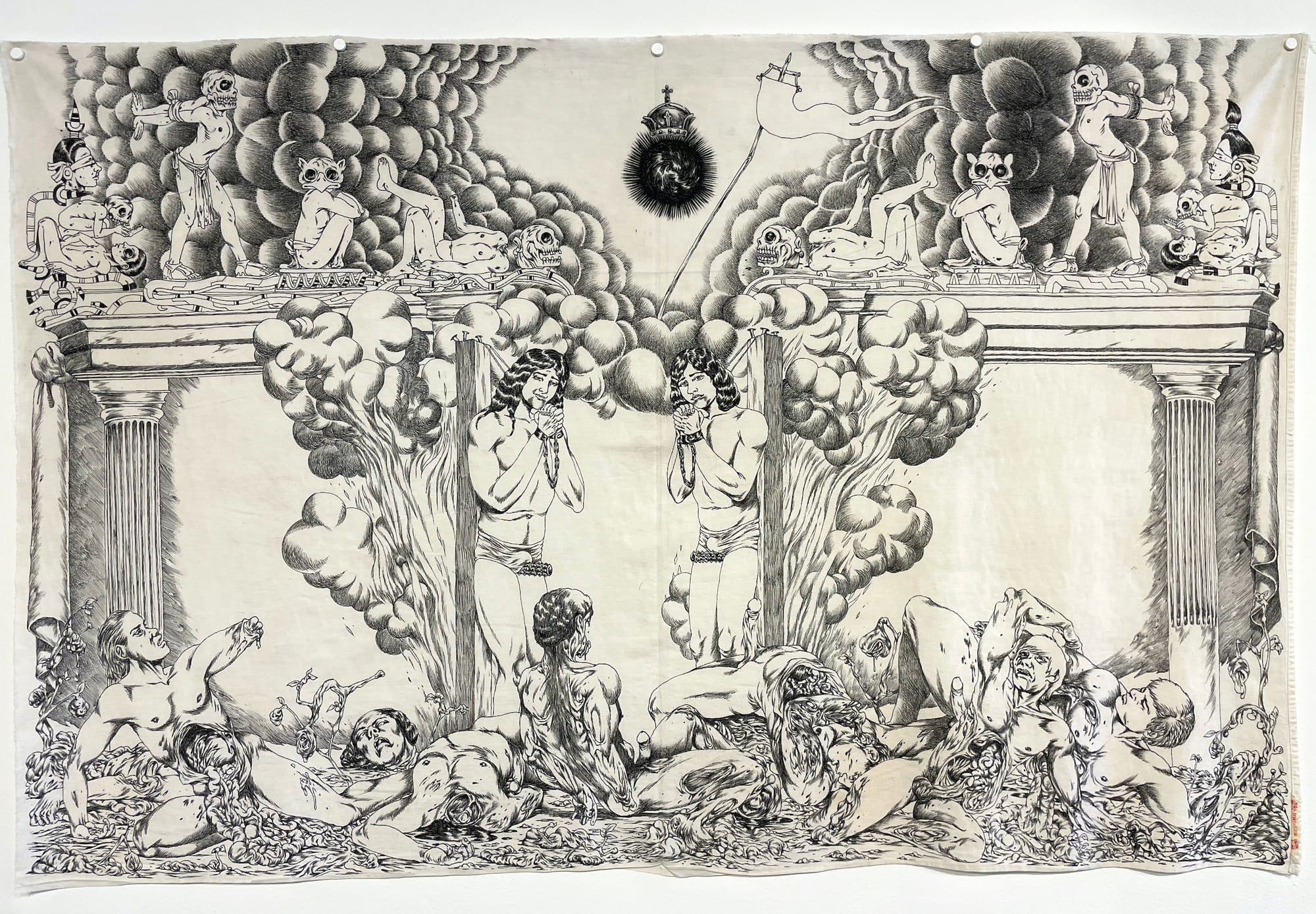 Founded in 1932, the nonprofit Detroit Artists Market (DAM) is one of the city’s art landmarks. Among a well-curated and cohesive selection of works, I was most drawn to those that center women as powerful protagonists in their own worlds, including Heather Benjamin’s trio of line drawings of nude women with cat-eye sunglasses in what looks like an Aubrey Beardsley-Guerrilla Girls mash-up, and Katharine Kuharic’s blissful paintings of nude women lounging in a fantastical realm. But Mavado Charon’s “Fire, Fire, Our Brutal Lover (Feu, Feu, Notre Amat Brutal)” (2021) — a black marker drawing on a white sheet, portraying a drama of earthly carnage and gods with animal heads — is an undeniable highlight of the show.