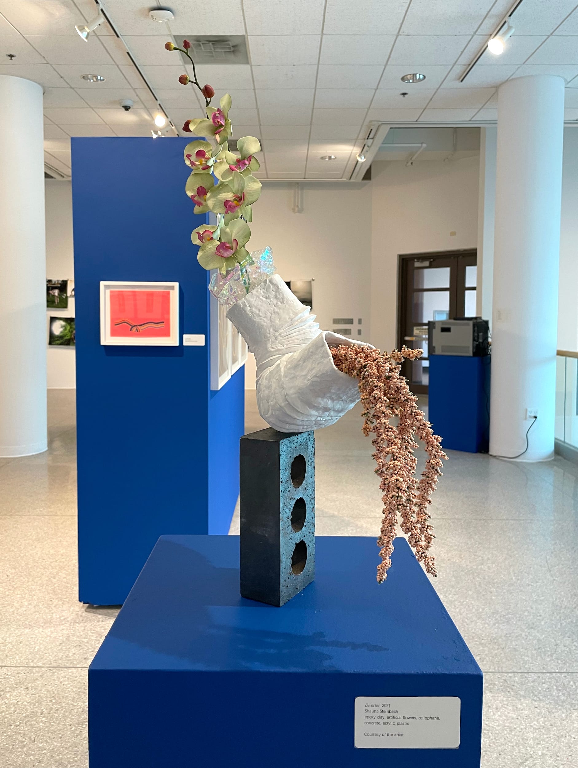 The Elaine L. Jacob Gallery at Wayne State University has been host to a number of impressive exhibitions over the years. This show felt the most global of those I visited, with the studied complexity of a university undertaking and a roster of bigger names. A portrait photograph of Sam Wagstaff, who served as curator of contemporary art at the Detroit Institute of Arts from 1968 to 1971, and a large abstract painting by Detroit native Brenda Goodman nodded to the city. Of this show’s many great works, A.L. Steiner’s photo series, Highlights III + IV (2024) engages with the lives of queer people through portraits that are by turns inviting and private, while Hugh Steers’s muted, gestural painting of what looks like a man washing another figure’s hair is wondrous in its quiet intimacy. And there’s something elegiac about Shauna Steinbach’s mixed-media sculpture of a tube of flowers balanced on a brick.