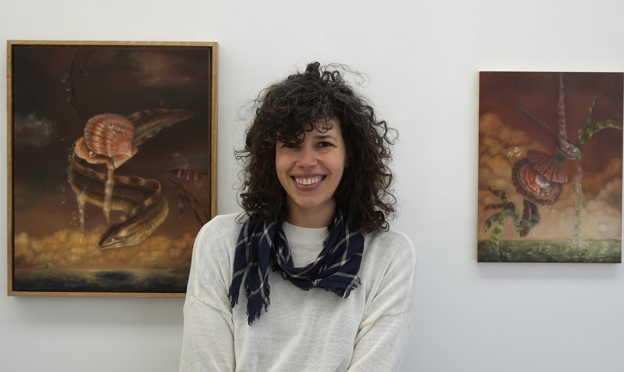 Deep Sea, Swallow Me is a fairy tale-inflected world of sentimentality and memory. Trice powerfully uses the metaphor of the pearl, which slowly forms in mollusks around an intruding irritant, to create an effect in which these scenes appear to secrete their own light. Her use of Old Master techniques, including an imprimatura layer, followed by a layer of grisaille, and then many glazes of color around what feels like a distant memory of pain or longing, generates these luminous images. Strong foregrounded focal points are framed by misty scenes often dominated by seascapes with low horizon lines. Trice’s art is lyrical, illustrative, and emotional. Like so much of the best painting being produced today, it casts its meaning just beyond our grasp in fertile soil that sprouts associations of all kinds. —Hrag Vartanian