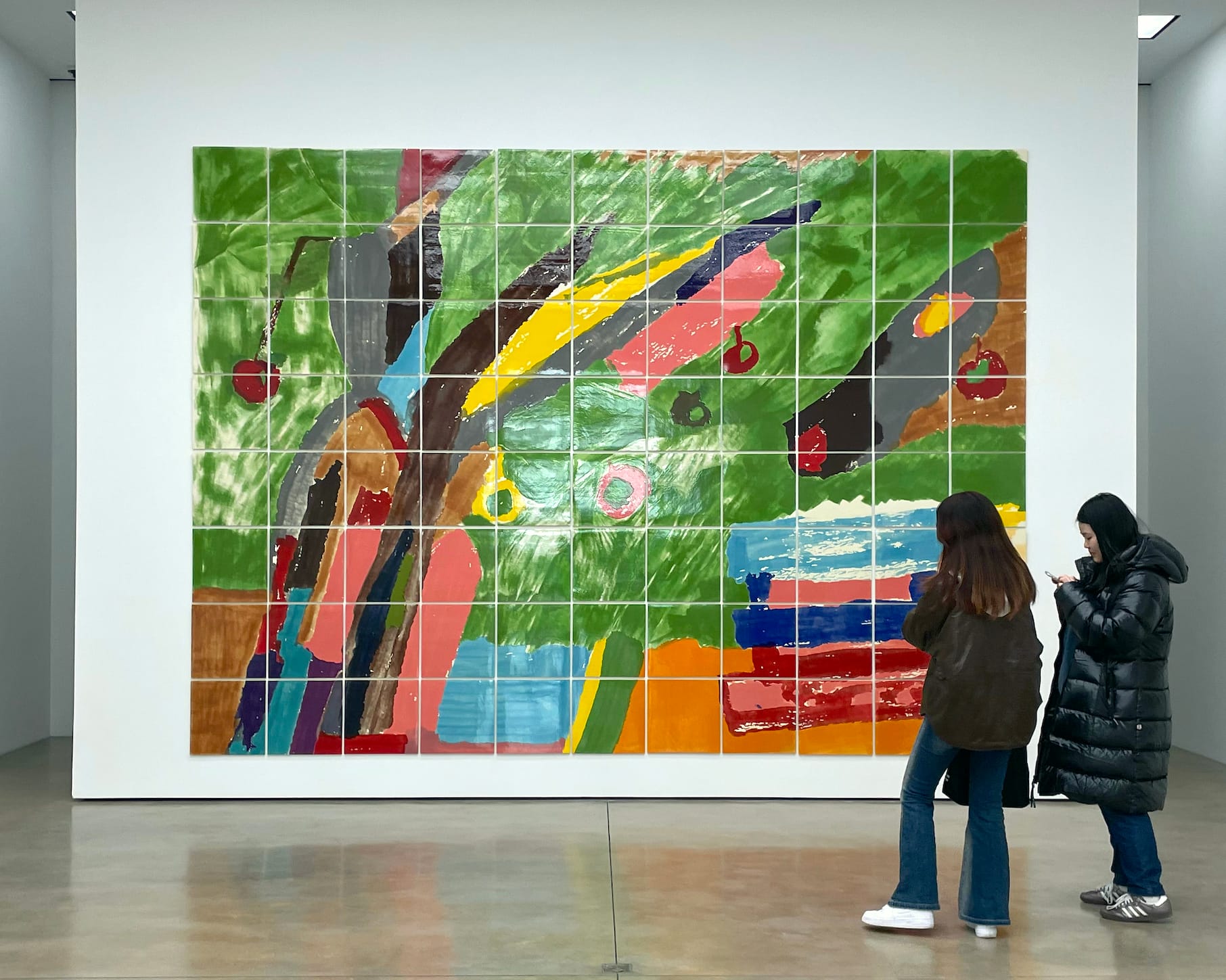 In Etel Adnan’s exhibition This Beautiful Light at White Cube, an emerald color field unfurls on a wall-sized grid of ceramic tiles. Among the uneven washes of green are blocks of primary colors and a multicolored shape thrusting diagonally across the picture plane, creating a sensation of whirring motion. This work, “Apple Tree” (2021), is the clear centerpiece, but paintings and tapestries comprise the majority of the two-floor exhibition. The small paintings on view allude to both landscapes and geometric abstraction. Their swaths of color, applied with a palette knife, evoke eroding forms, or the dominance of nature’s will over humankind’s. A selection of tapestries reference the idea of home as both a real place and an unsettled abstraction for an artist who traversed multiple cultures. —NH