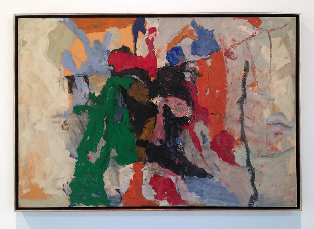 A piece like “Fable II” (1957), one of the earliest works in the show, done in oil on illustration board, represents a solidification of the formerly shimmering paint strokes of the artist’s previous abstractions. Craggy, organic forms in green, red, orange, pink, black, and brown converge on the center of the canvas, where they are compressed like fault lines between two off-white tectonic plates on the right and left.