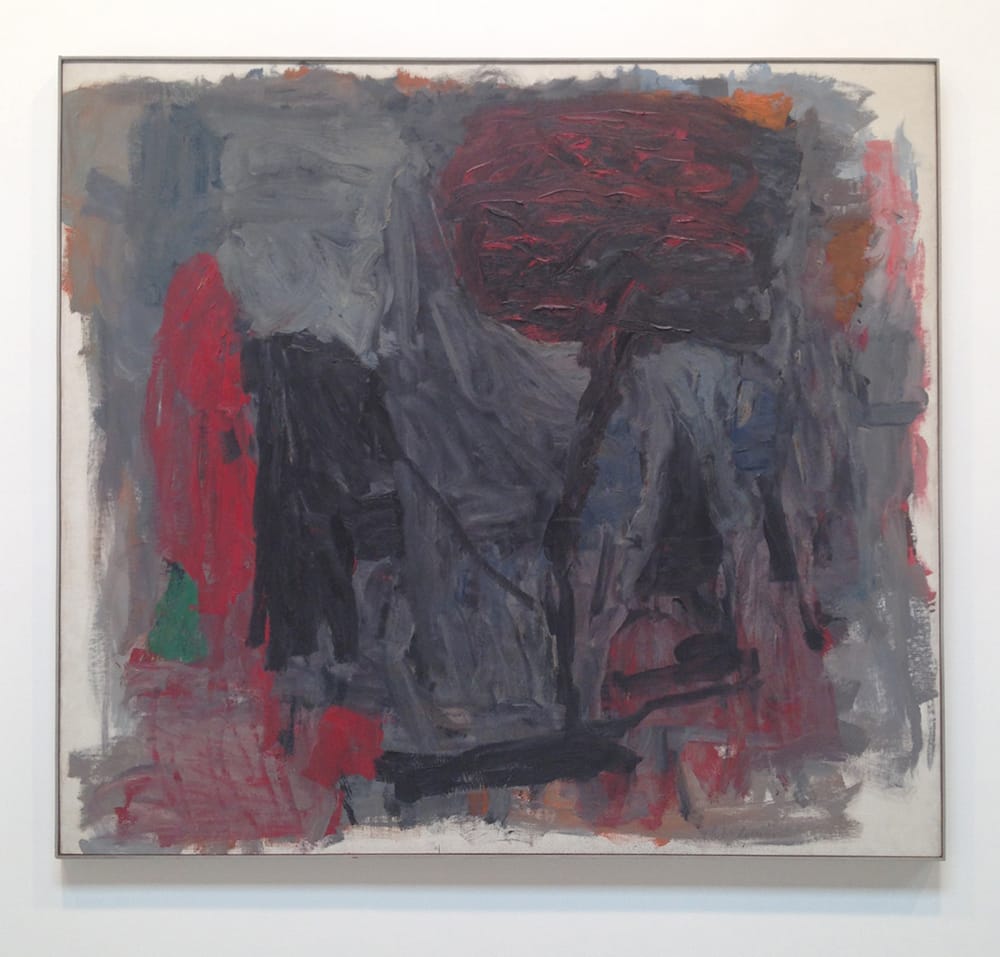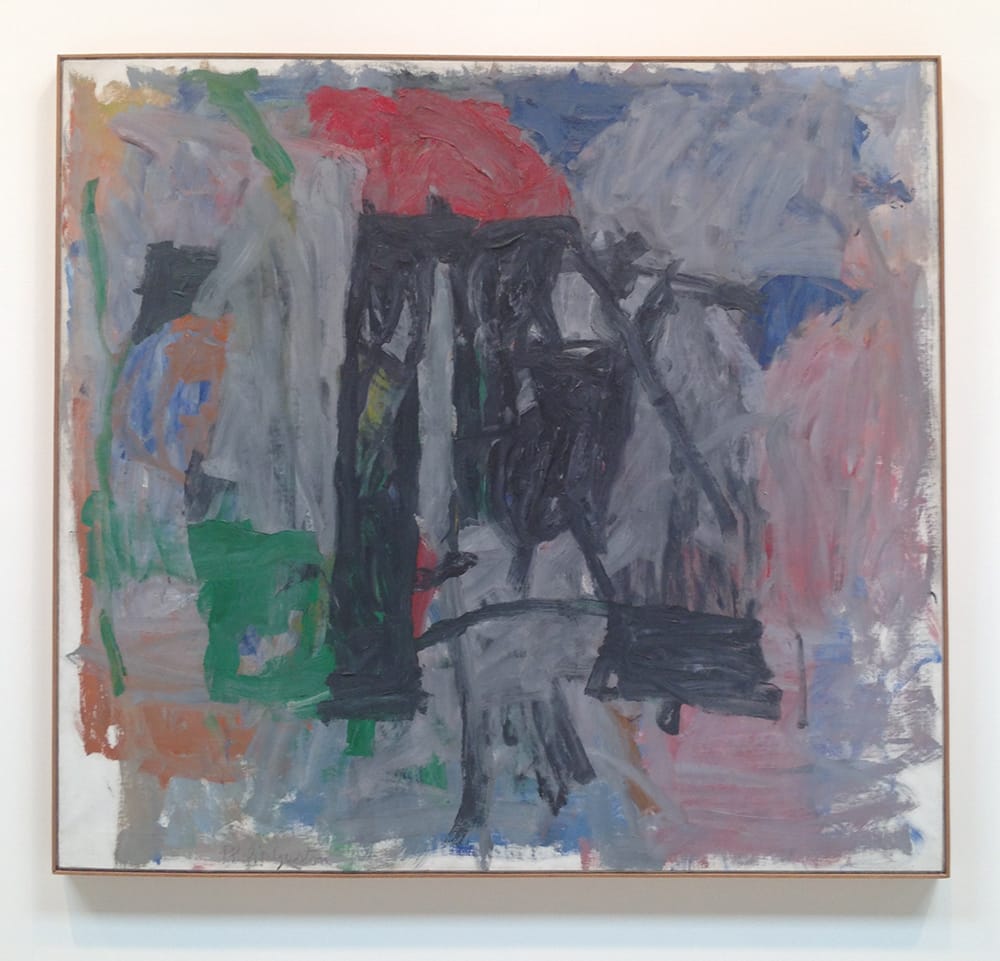 A large work from 1959 — 65 x 69 inches — is dominated by two vertical shafts in the center of the canvas, which resemble black scaffolding or buttresses topped by a reddish-gray blob. Its title, however, is “Painter,” and suddenly what could have been read as an abstracted industrial landscape is now imbued with a figurative dimension. Are we looking at Guston’s idea of a painter’s essence (not an uncommon line of inquiry for the time) or is the image a caricature of a long-legged artist in black pants and a red shirt (or, more satirically, a smock)? Is that his arm shooting off to the left, near the top of the canvas?