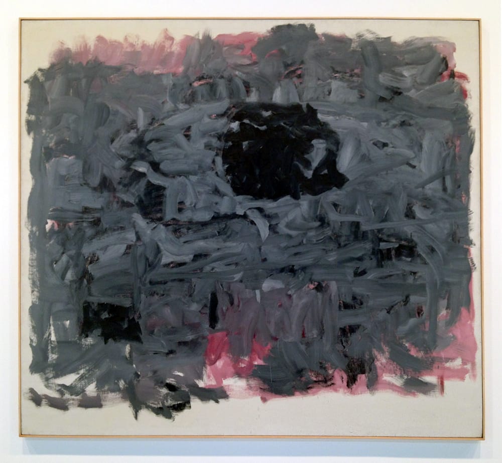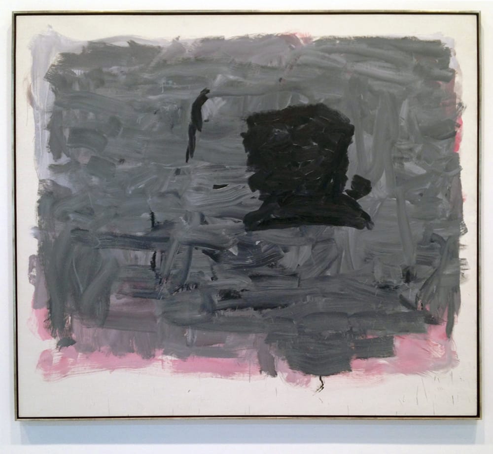 In all of these paintings, one or more black, blocky forms, suggestive of human heads, hover above a field of agitated gray or gray-over-pink brushstrokes. (The explosion of velvety gray paint to the left of the central black coffee-cup-shape in “Stranger” is a miracle of sensual materiality.) This is the part of the exhibition that initially felt overhung with similar canvases. However, after giving it a little more time, I began to see the subtle but lively interactions among the paintings’ formal elements, especially in the trio comprised of “Portrait I,” “Stranger” and “Reverse” (1965), mounted across a single wall.