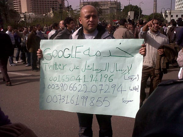 The most stunning photo is of a man (above) walking around with a sign explaining how to tweet via phone, the sign reads “Google service to send messages to Twitter call the following numbers … ” Thank you @ayadh & @aliciad3 for the translation!