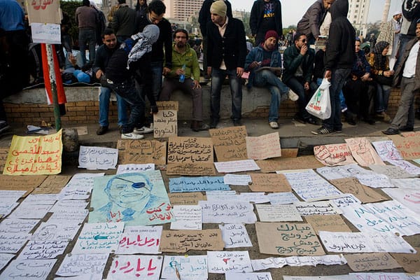 Cairean amateur photographer Tarek has been curating an interesting set of photos on his stream, including many protest signs that vary from the folksy, cartoony (1 & 2), sidewalk signs, and some targeted at tourists, though I really like seeing one image of protest signs and flags against the backdrop of a KFC franchise.