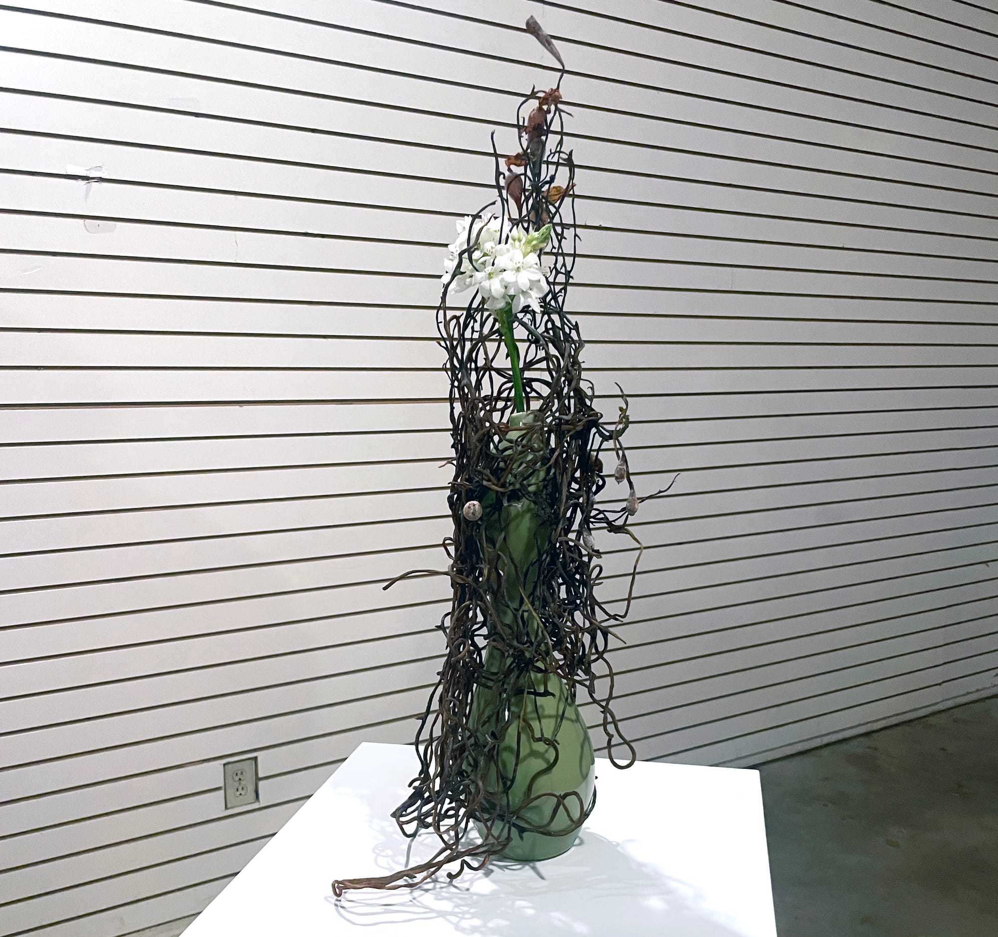 Over three weeks, groups of four florists will have carte blanche with the gallery. With the plants’ short lifespans and inhospitable gallery conditions in mind (Canary Test has no windows, no temperature controls, and can become a stuffy, hot box), the florists receive only three days to show their arrangements, which will wilt and wither away by the time the weekend concludes.