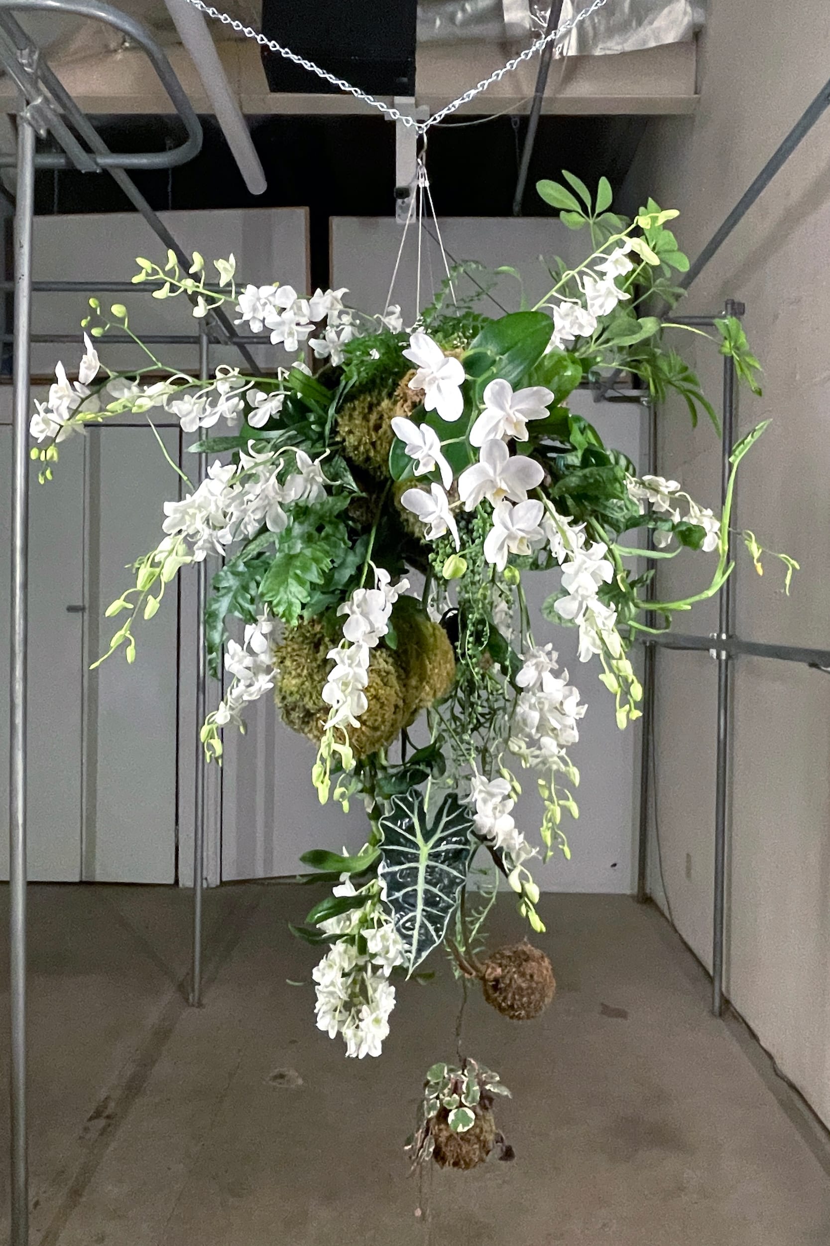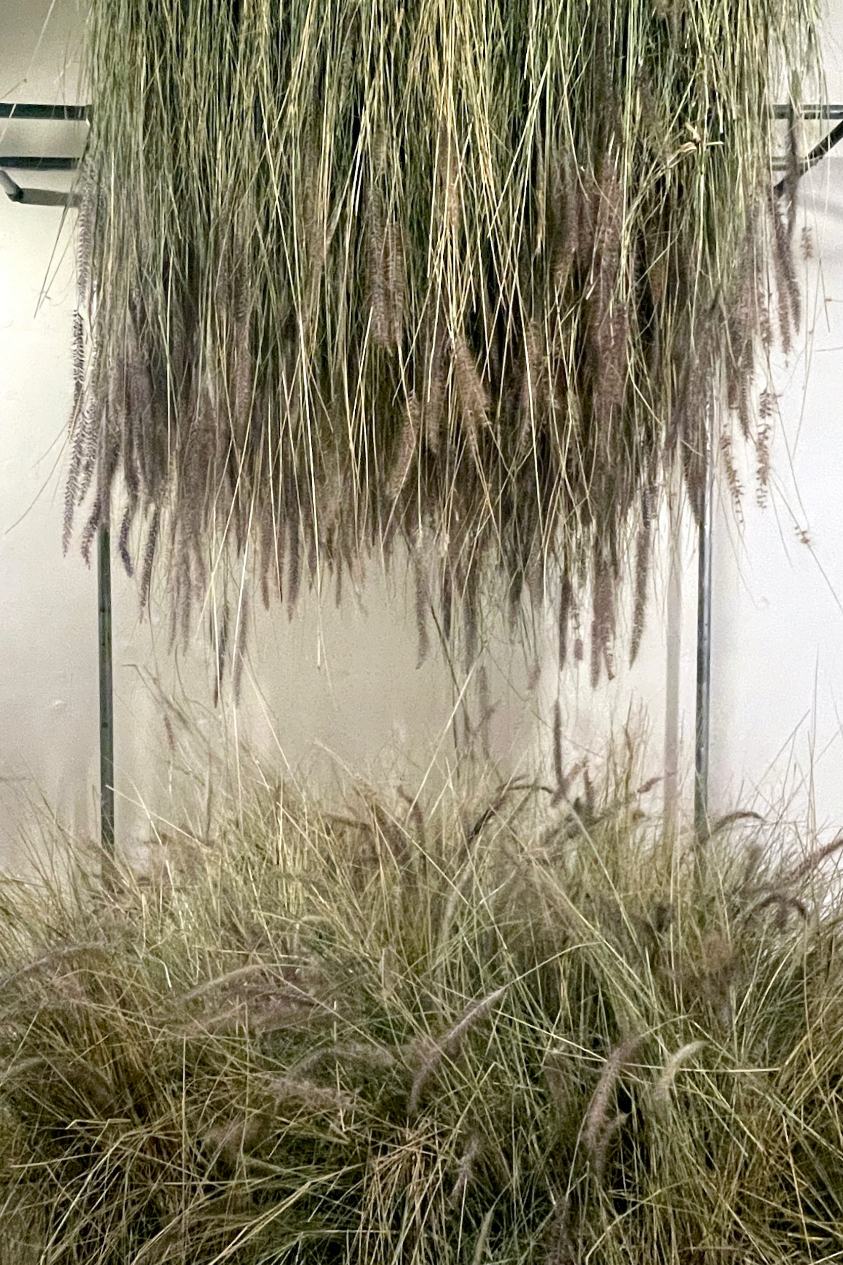 In the front gallery, Harris’s colossal, colorful arrangement placed blue feathers among dried flowers and a willowy rag rug while spade-shaped chromatic green anthuriums burst through the brush. Behind it, Gork’s understated tangle of dried seaweed enveloped a vase, a family heirloom her grandfather purchased after his family lost everything in a Japanese internment camp. Beyond these arrangements, in the second gallery, large bundles of Cenchrus Setaceus, or fountain grass, recreated the overgrown terrain in the Santa Monica mountains. GUNNAR harvested the invasive plant herself and suspended one group of cuttings above the other, the plant life seemingly mirroring its overwhelming presence in the wild. Peng’s suspended bouquet of ferns, white orchids, and Adanson’s monstera, which appear to grow from moss balls, ended the presentation on a meditative note.