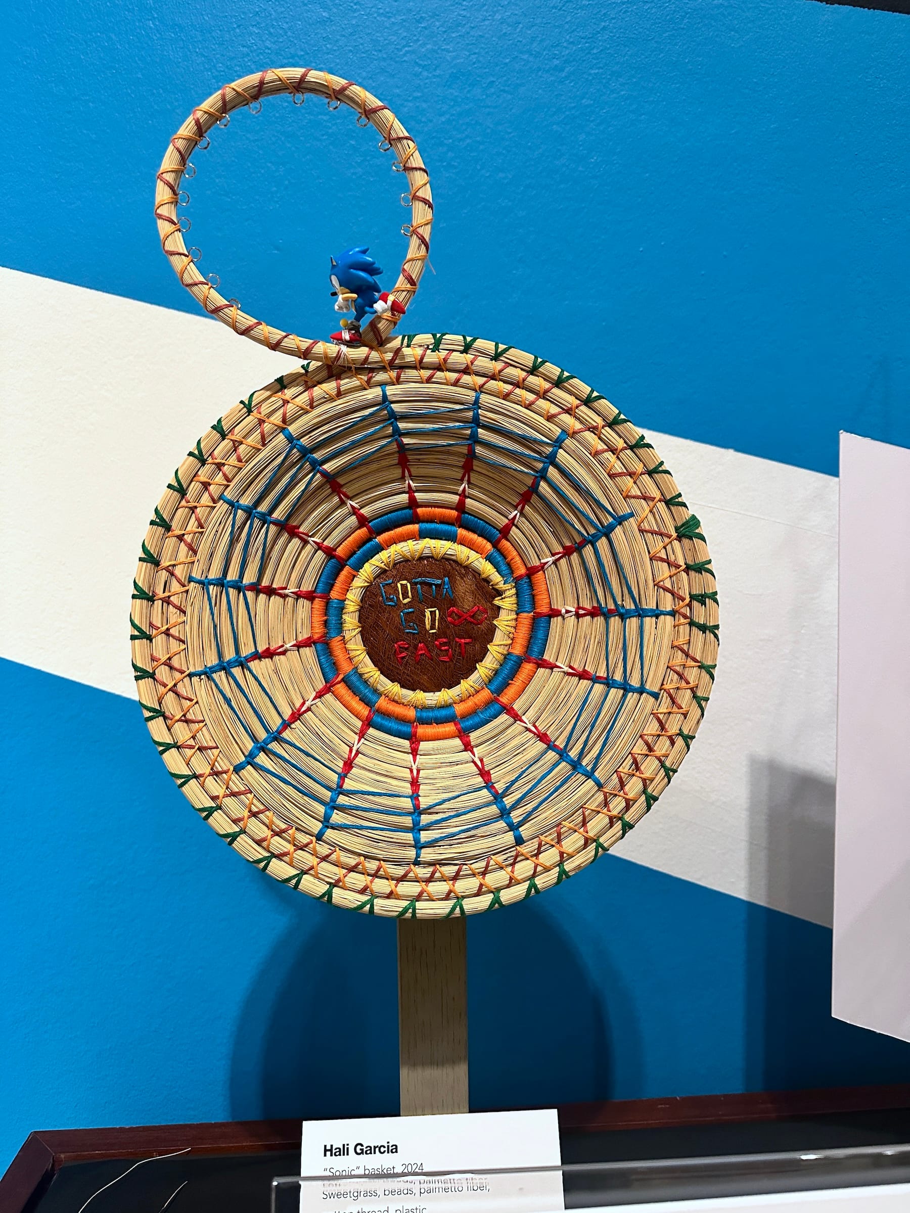 Hali Garcia, a sweetgrass and palmetto fiber artist and educator who was born on the Seminole Hollywood Reservation, also melds past and present in her meticulously woven baskets. The complex technique is typically passed on by older women to young girls. Garcia introduces her own quirky twists, like her love of comics and Nintendo; one piece on view is inscribed with the words of Sonic the Hedgehog’s iconic theme, “Gotta Go Fast.”