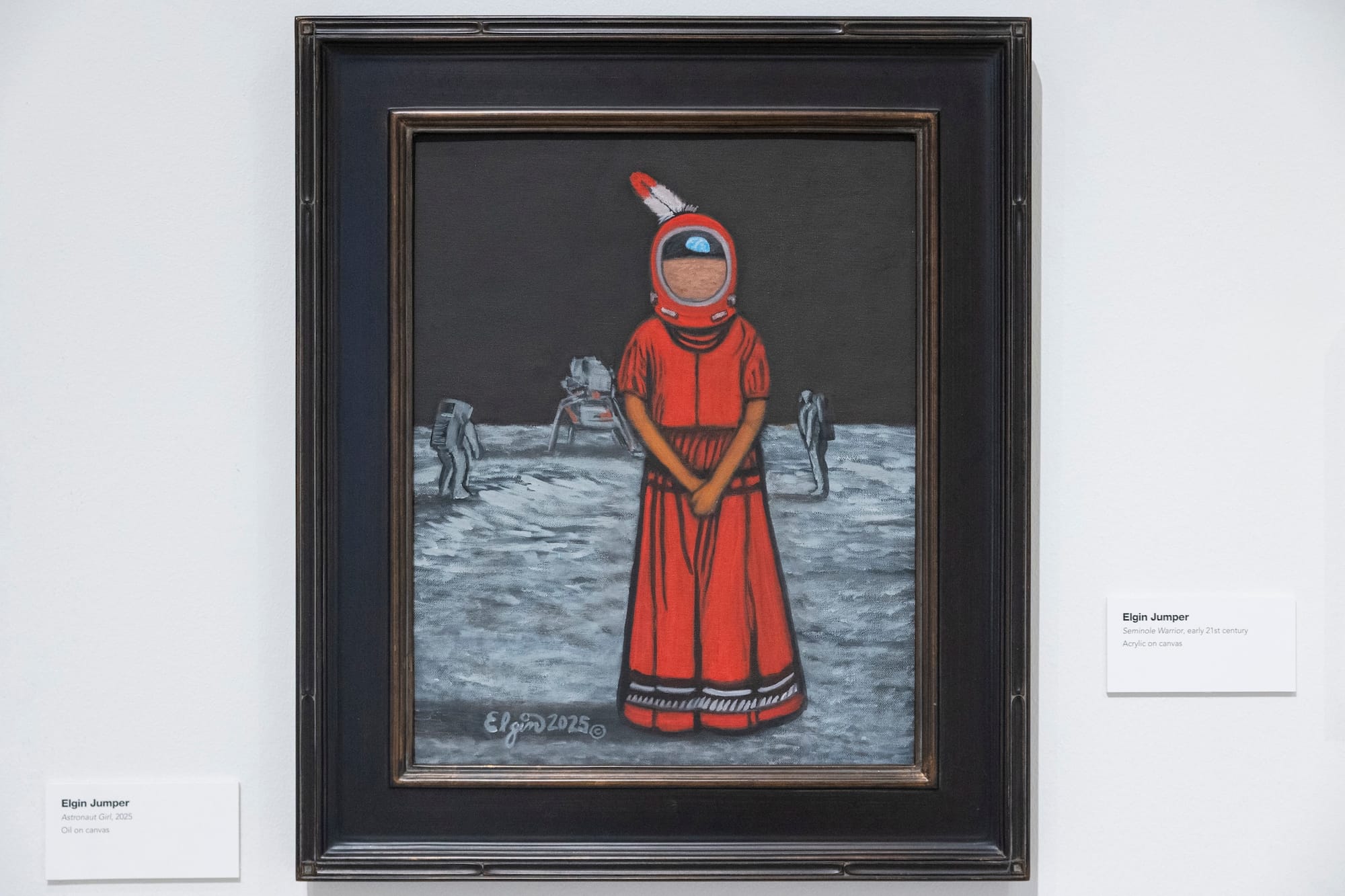Many works in the exhibition exude unfettered pride and joy for Native identity: for instance, a life-sized Seminole doll by Ronnie and Mabel Doctor, or Elgin Jumper’s charming painting "Astronaut Girl" (2025), whose titular subject stands on the lunar surface wearing a red helmet with an eagle feather.