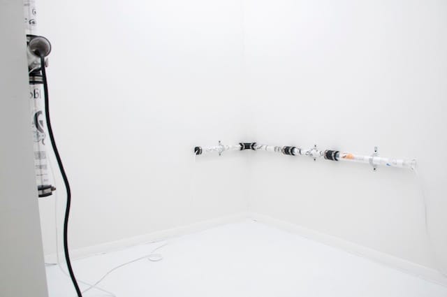 In the main room of this apartment gallery, variously arranged transparent and black tubes are affixed to the wall. Slips of white paper inside hold messages, like ships in bottles — except these tubes aren’t sailing anywhere, and neither are the notes. On one piece of paper wrapped inside the tube, we see the text “Anyone who has ever sucked my dick” and “Meditate inward,” and “A clownish.” Much of the text is cut off mid-sentence. In another tube, we see “Planet Human” in Olde English text. A yogi teabag wraps around the inside of another tube. A black cord attached to a tube in one room slithers out the door, sneaking into the corner of the hallway space, where a plastic container loaded with fake blood-covered shells, two speakers, and clear saran wrap reside. Meandering back into the tube-filled room, it becomes easier to notice the snail shell that sits in the corner, with a pool of blood inside it. Stickers of bullet shots appear on walls and doors. The drip-drop on the echoing soundtrack runs on a loop with textual mutterings like “your feelings of like … http://www.youtube.com/ … ” measured against the intermittent barking of a that dog trails off, fades in, and pulses out, creating an ambiance of disembodiment through internet URLs and synthetic feelings.