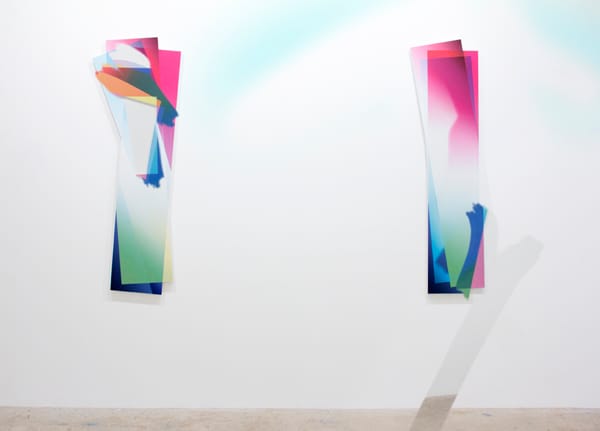 The five sculptural works on view are connected by their preoccupation with light and neon color. The sculptures lead a double life. In the gallery they have a strange optical quality. Viewed online they float in eery back lit brilliance. The difference provides a case study for how the medium effects the message. Incandescent screen shots pulled from somewhere within Vierkant’s mind’s eye. As he works, individual instances are time stamped and deemed “finished.” The process continues, an onscreen ballet of geometric color. This is a time lapsed performance that bridges the space over the keyboard; the realm between bodily experience and raw digital information.