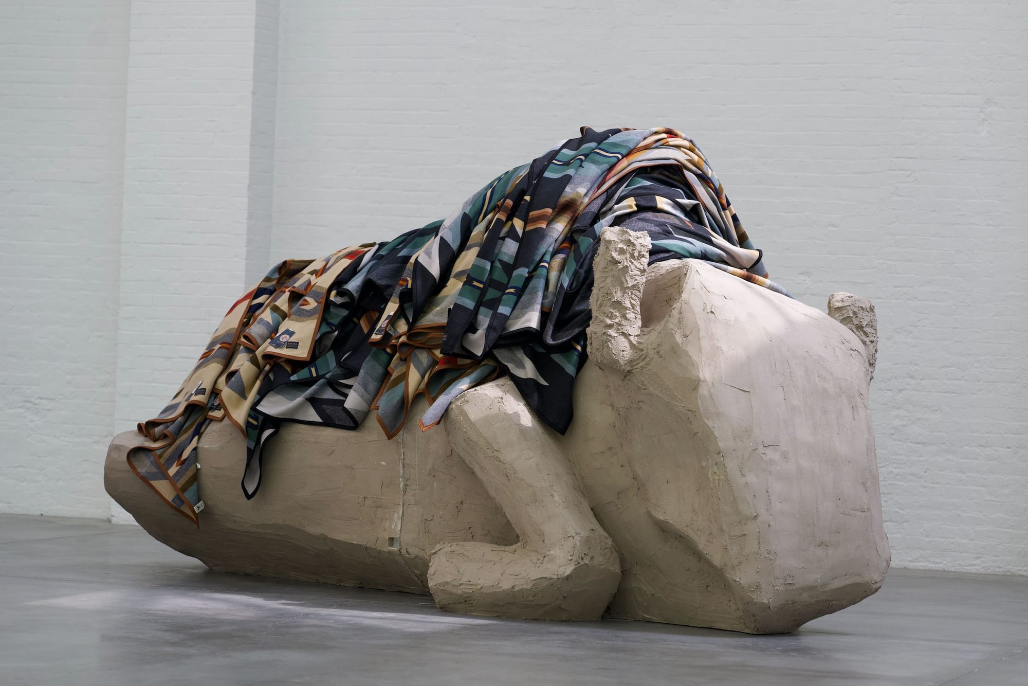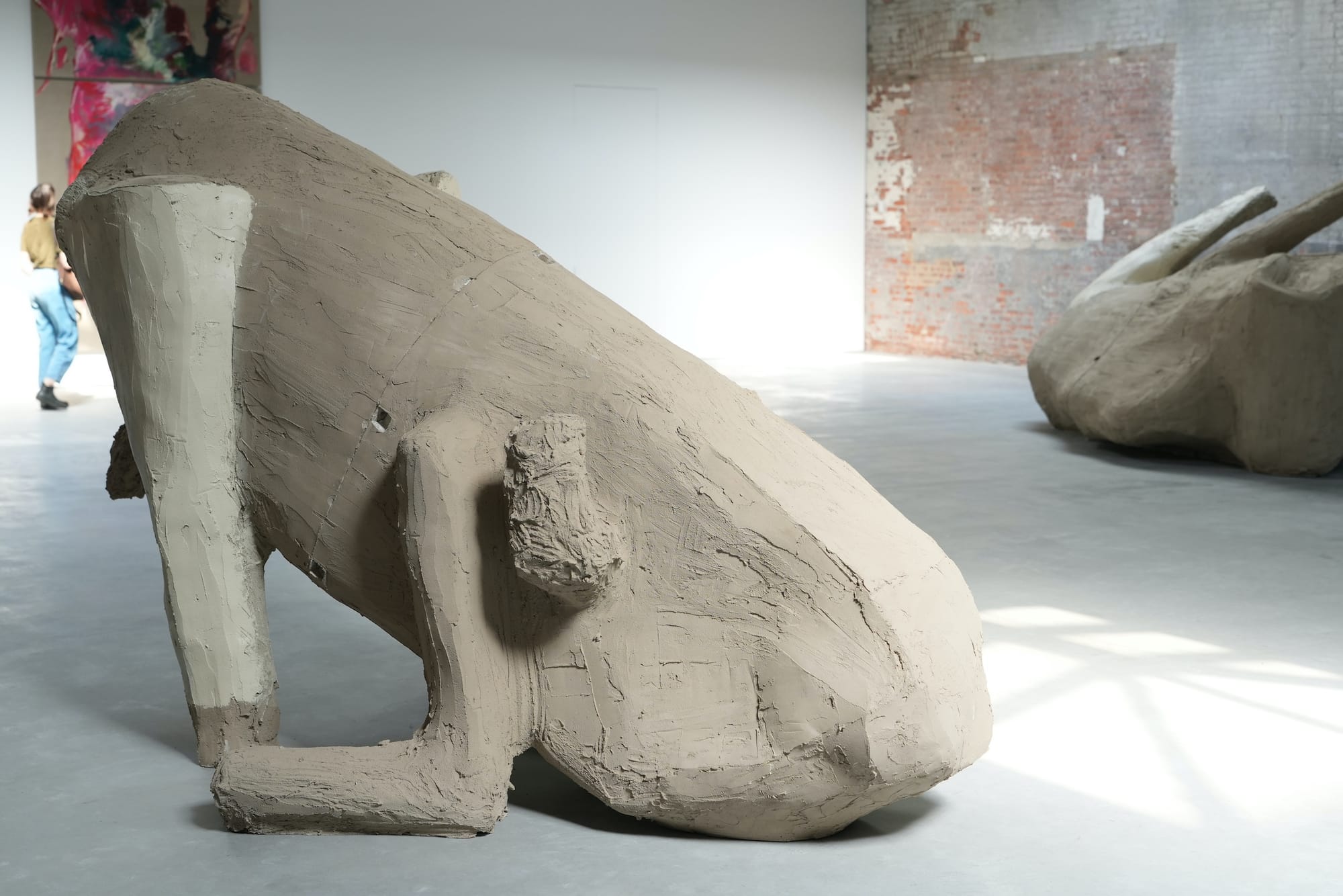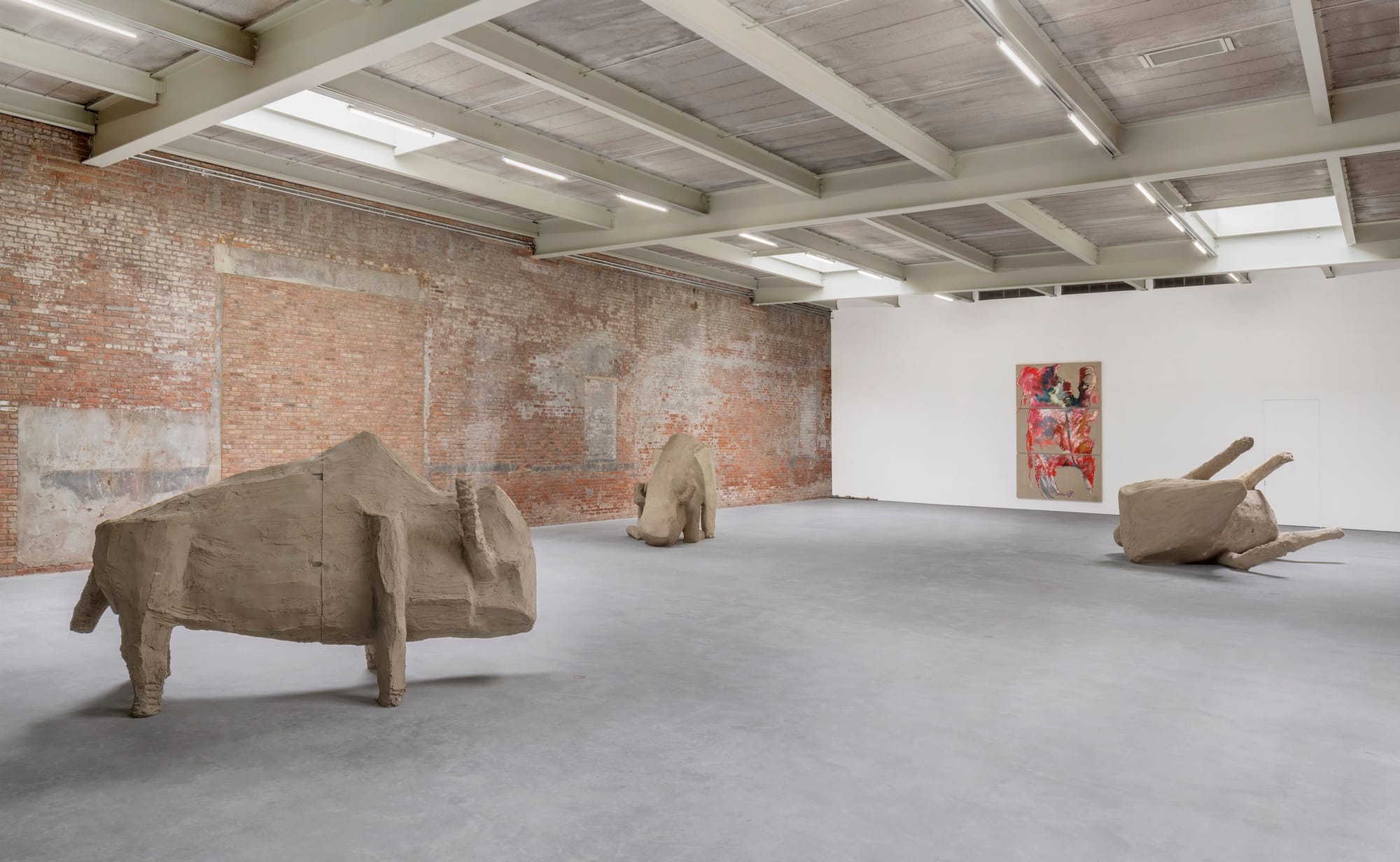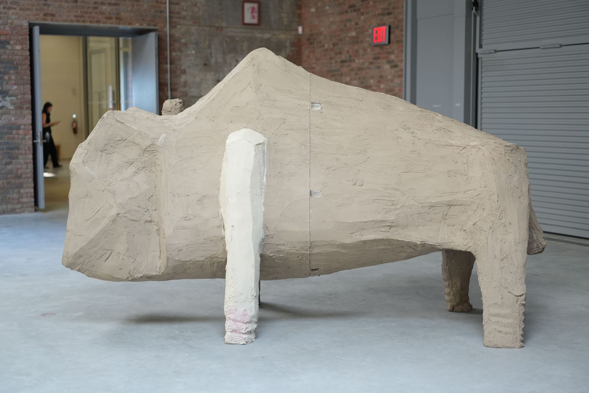 Linklater not only lets buffalo run free in 12 + 2, conceptually at least, but in the installation, performance, and paintings on view he also reimagines the world in their terms. Given the mutual identification, coexistence, and interdependence between Native people and the species across millennia, the move is an act of imagining the Earth in and through a lens of Indigeneity. Seven of the beasts, which the artist fashioned out of wire and papier-mâché before scaling them up to two or three times their natural size, make themselves at home in two vast galleries (together they're titled “wallowposition”). Their faceted planes and visible seams where components connect give them a slightly robot-like appearance. They are eyeless, featureless really, covered in dun-colored plaster that mimics mud. But they are also vivid, animate, and expressive — adorable, even. One kneels on its front legs, perhaps drinking water. Another has plopped itself on its side, legs flailing in the air. Yet another, an adolescent with long legs and a head smaller than the rest, seems to be caught mid-trot, while a baby sploots on the floor.