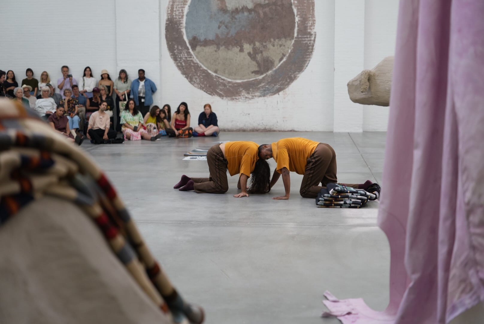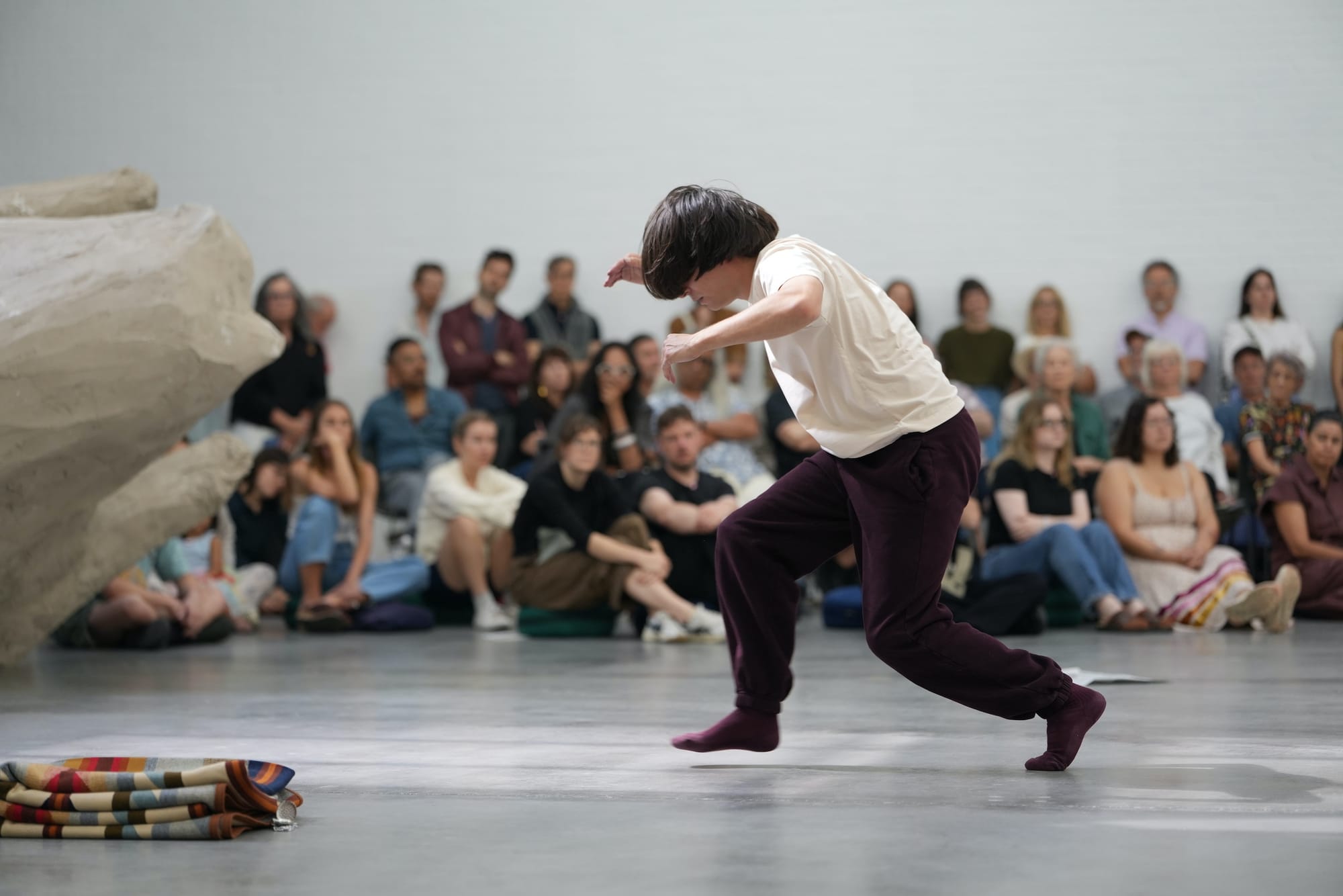 Despite his buffaloes’ monumentality, Linklater preserves the galleries’ vast openness to accommodate the work’s crucial performance component. On Saturdays afternoons, “bison bison (dance_hum for dirtbath)” takes place, written and choreographed by the artist Tanya Lukin Linklater, Duane Linklater’s wife and frequent collaborator. Over the course of 44 minutes, dancers pace around the room, experiencing this virtual landscape the way buffalo might. At times they undertake activities meant to honor or map it, as when a performer makes charcoal rubbings of the granite plugs in the floor. Their activities drive the music, “buffalounit,” composed by eagleswitheyesclosed (a collaboration between Linklater and his son Tobias) and played by a drummer, cellist, and bass guitarist. Over seven weeks, the number of dancers and musicians will winnow away, ending with a single percussionist and a single figure in motion.