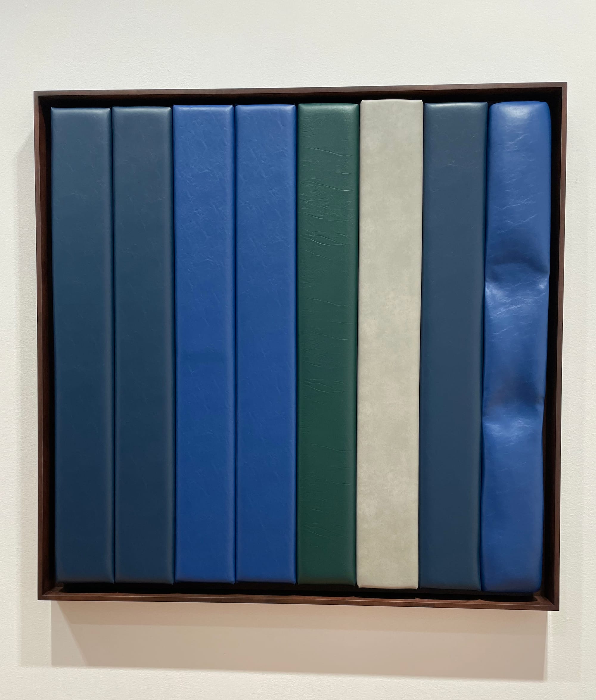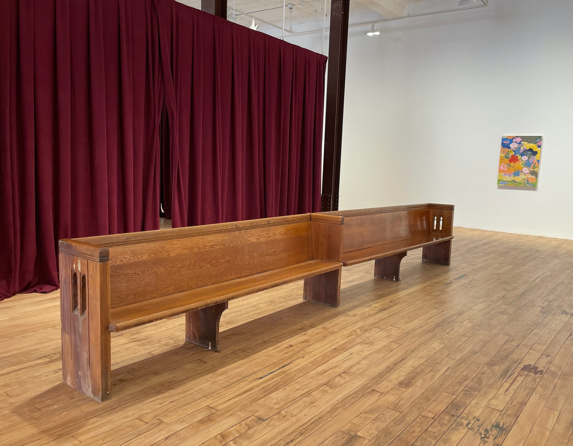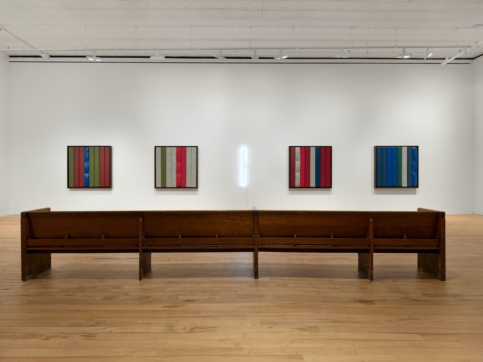 Upon first glance, Hill’s inspiration for the artworks appears to be less his childhood Catholicism than the agnostic faith of modern art: The first neon work on view is a tall, white rectangle flanked on each side by square “paintings” of multicolored vertical stripes that are actually composed of the kneelers’ cushions with indentations from the artist's knees. A long wooden church pew faces the wall. All together, they invoke modernism’s sacred or quasi-sacred spaces, from the Rothko Chapel to a James Turrell installation.