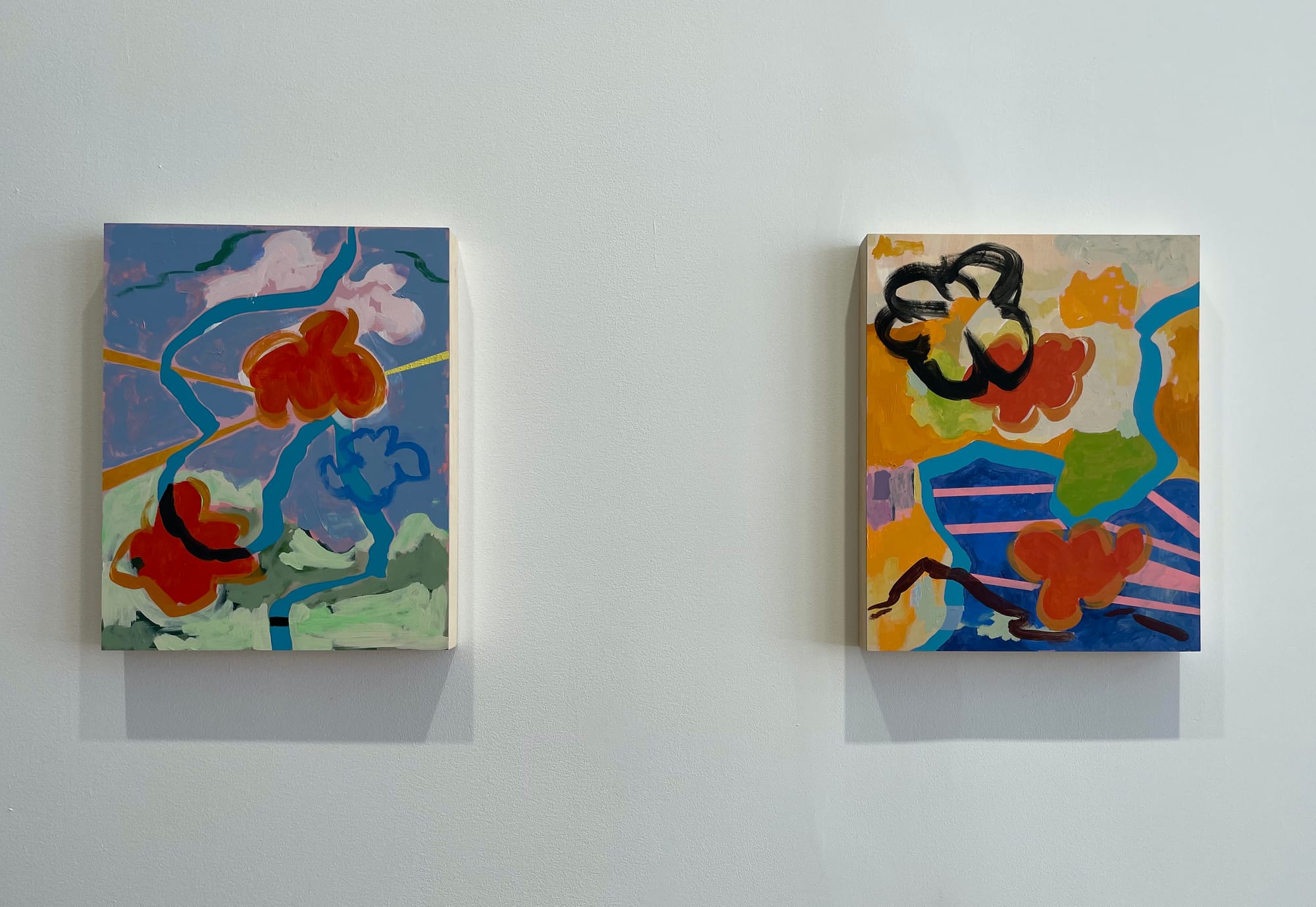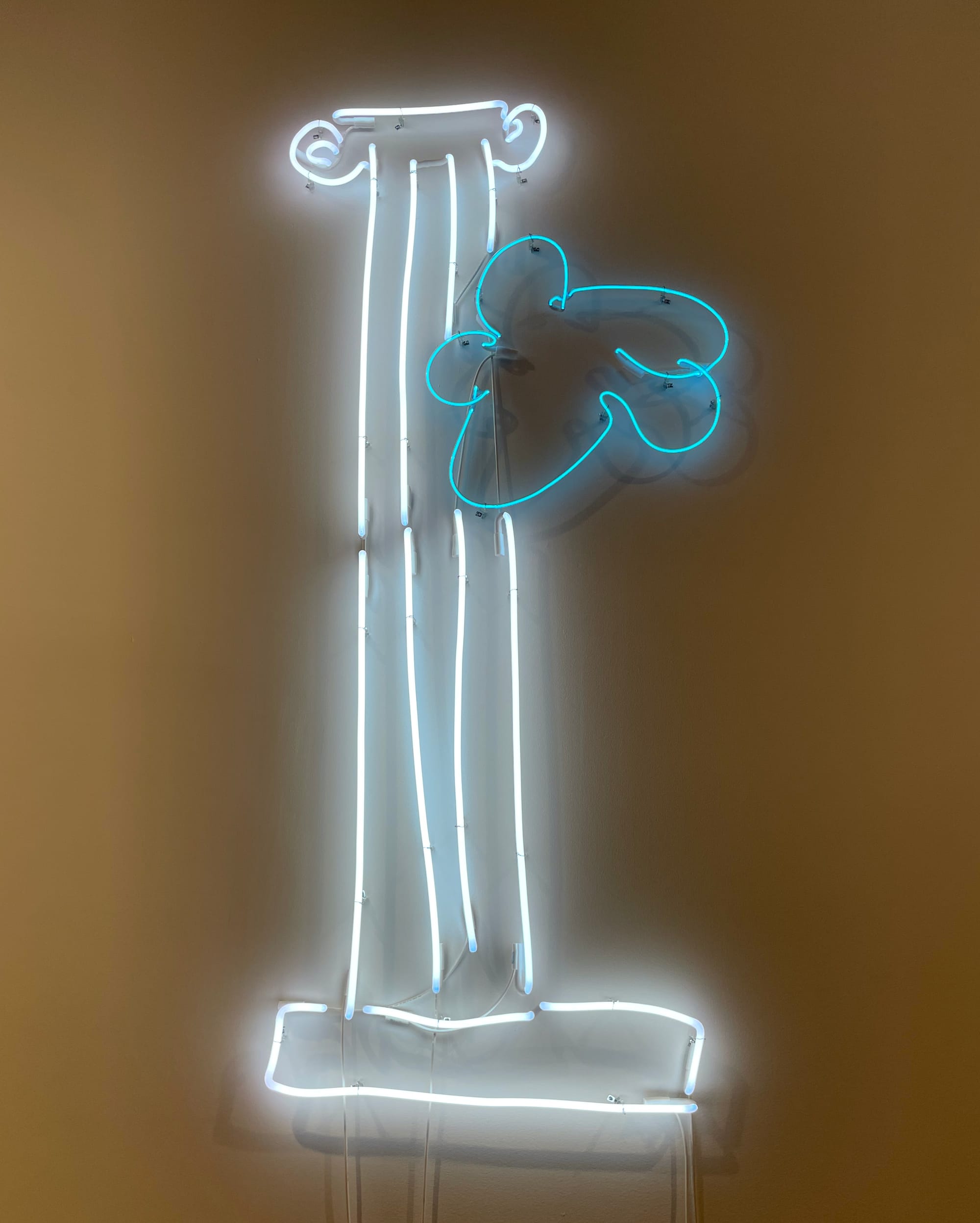 On its own, the idea of artworks made from ecclesiastical objects evoking modernism within a white-cube gallery feels a little too on the nose, at once enamored of its predecessors and self-evident. And several colorful paintings depicting clouds and flowers can come across as too cute in their naivete; Hill displayed similar works in 2022 at OxyArts in Los Angeles, where they were tasked with carrying perhaps too much of the show’s weight. The difference here is his actual presence. It’s understated — he can be glimpsed through a sliver in the crimson curtains, and he might not register at first if you’re not already aware he’s there. Viewers can enter the curtained area a few feet behind Hill, where a more elaborate neon work — a white Ionic column with a blue cloud attached — is installed on the wall.