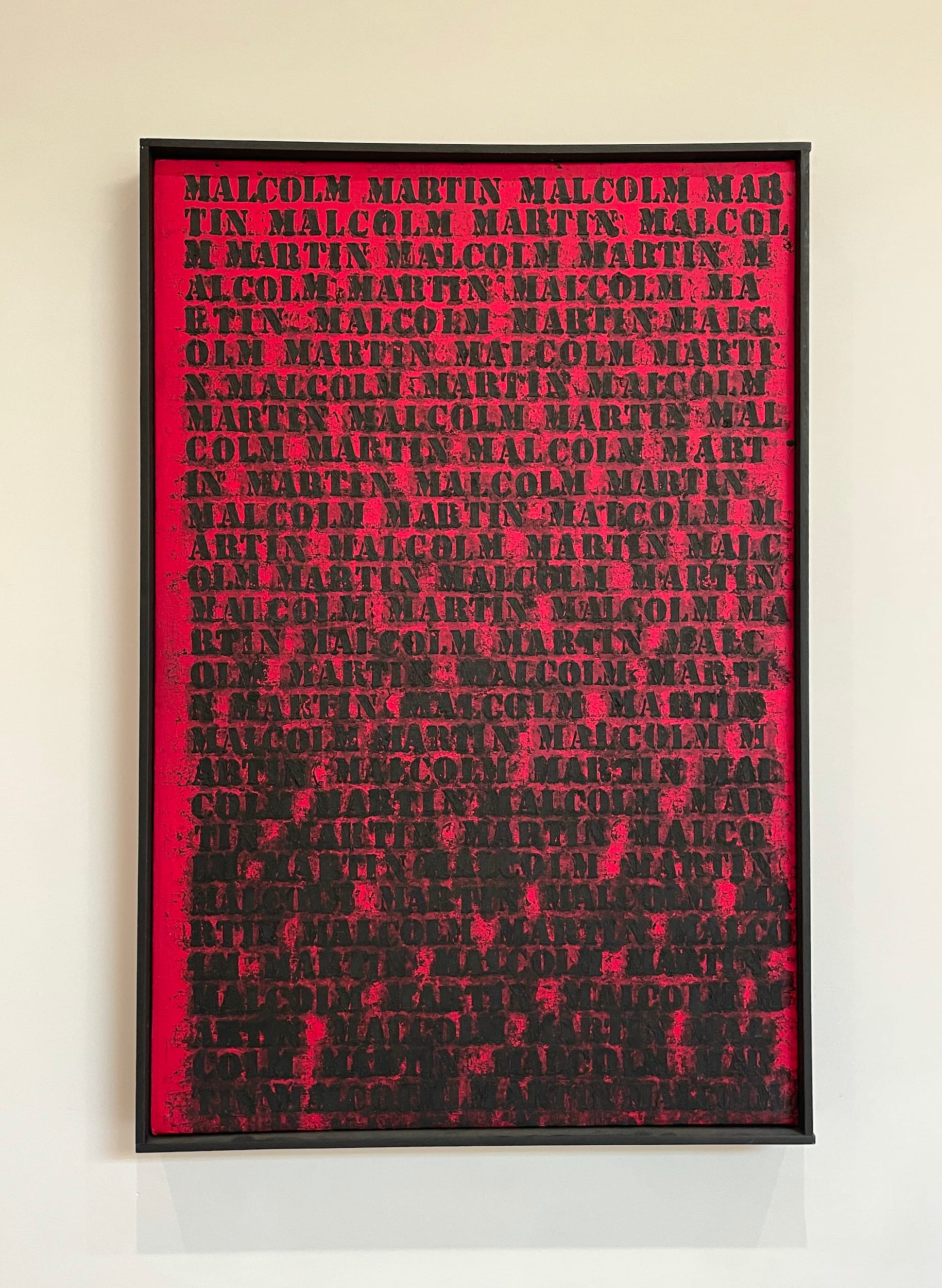 A text painting on an adjacent wall alternates the names “Malcolm” and “Martin” in black on a red ground (“Deferred (Malcolm/Martin),” 1991). As the repetition transforms the names into sounds, they visually degenerate, becoming almost unreadable at the bottom of the canvas.