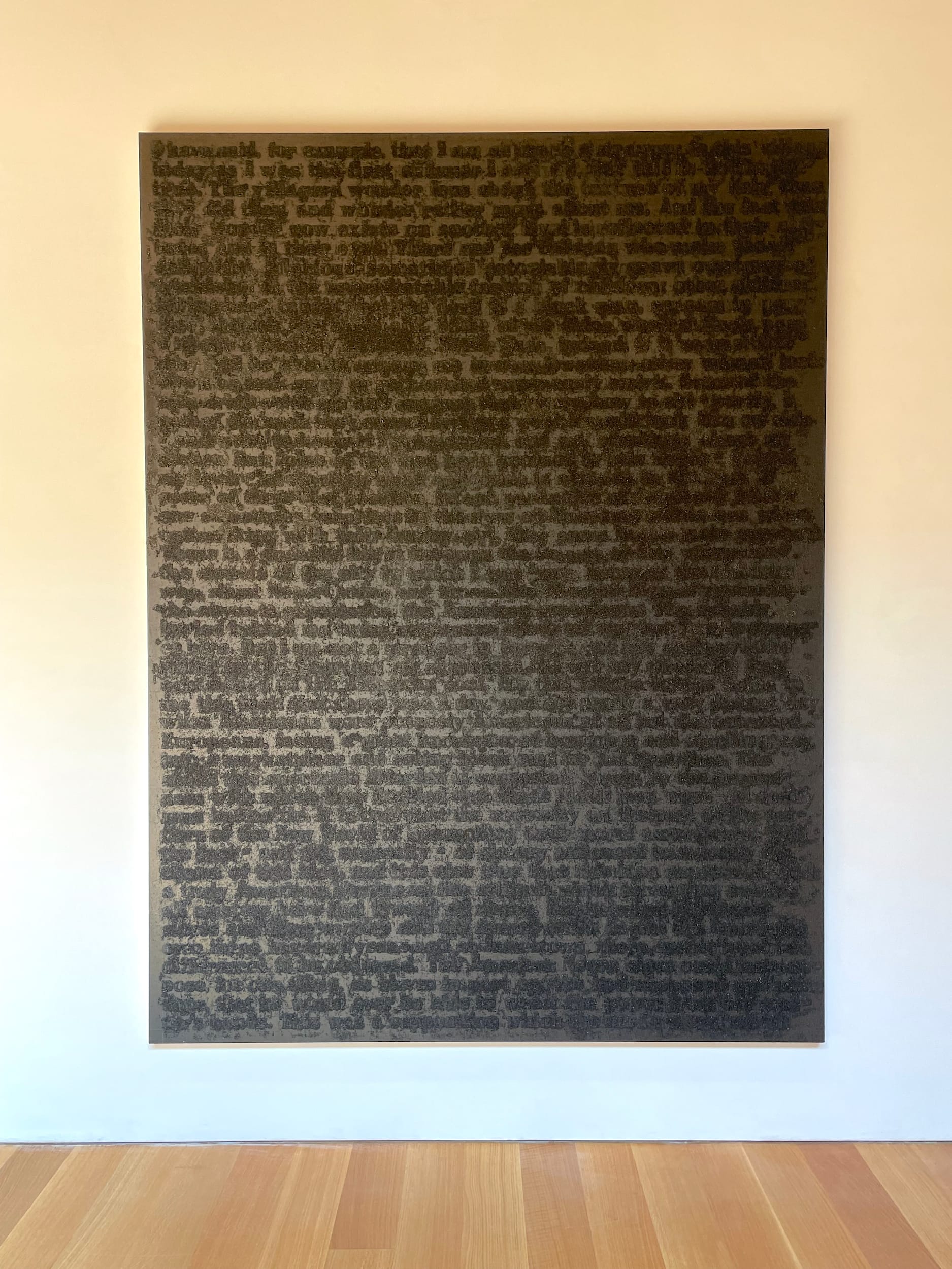 Other works take the limits of language further, including “Stranger #64” (2012), where illegible text from James Baldwin’s essay “Stranger in the Village" (1953) becomes a palpable object through layers of oil stick, acrylic, and coal dust. What’s initially an aesthetically enticing dark gray surface emerges as an unsettling embodiment of Baldwin’s story of the racism he encountered in a small, all-White town in Switzerland.
