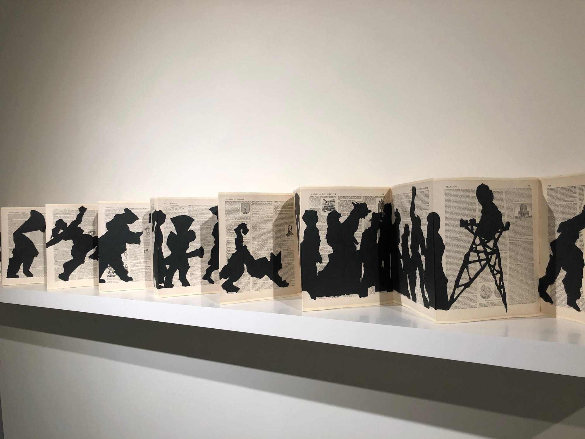 William Kentridge, “Portage” (2000), Chine-colle of black Canson paper on pages from Le Petit Larousse Illustrated (c. 1906) mounted on Arches Creme paper, folded as a leporello, page: 10 13/14 x 9 1/2, unfolded: 10 13/16 x 166 9/16 inches