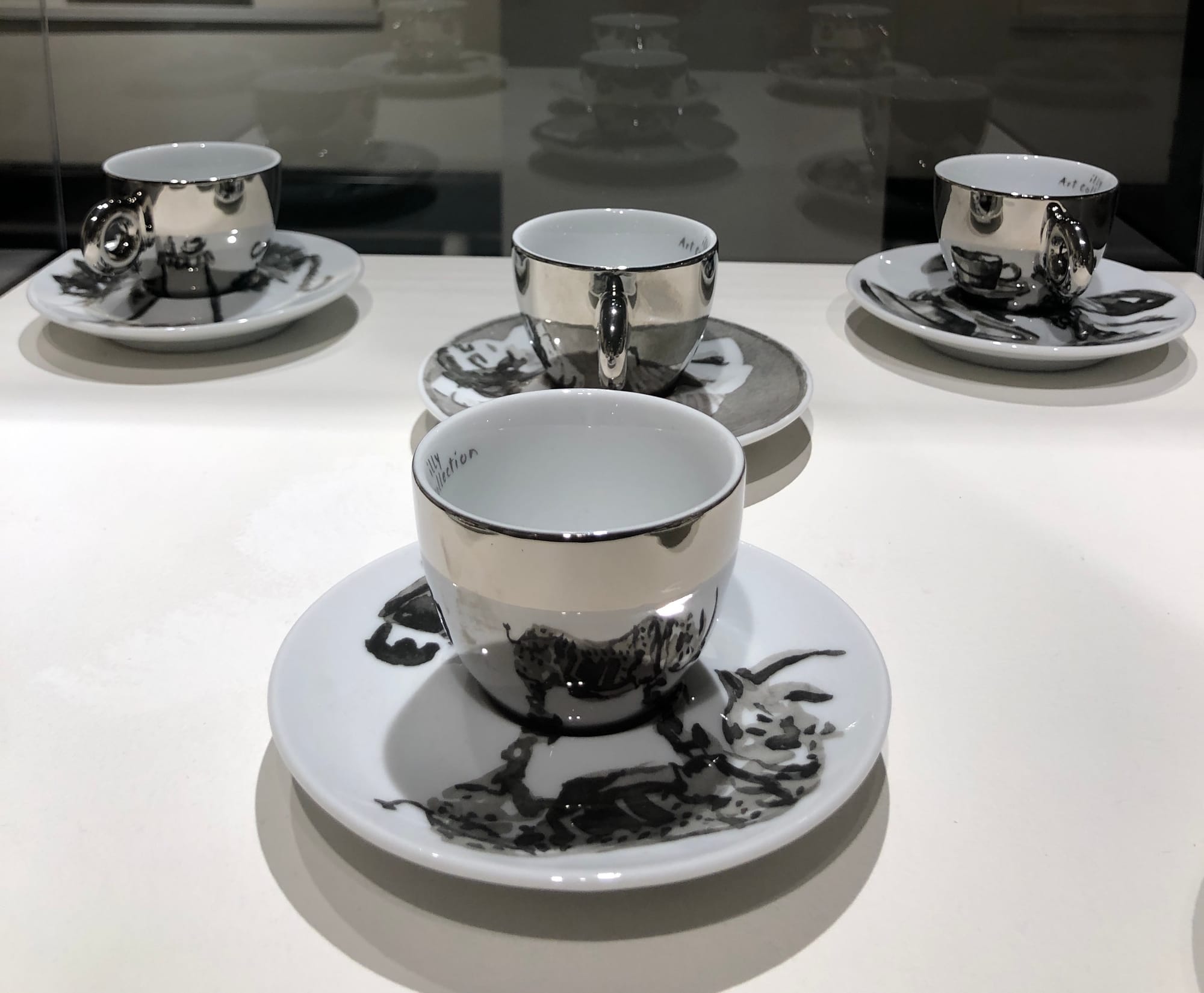 William Kentridge, set of 6 demi-tasse cups and saucers (2008), ceramic cups with mirrored glaze; ceramic saucers with transfer illustration, produced for the Illy Art Collection