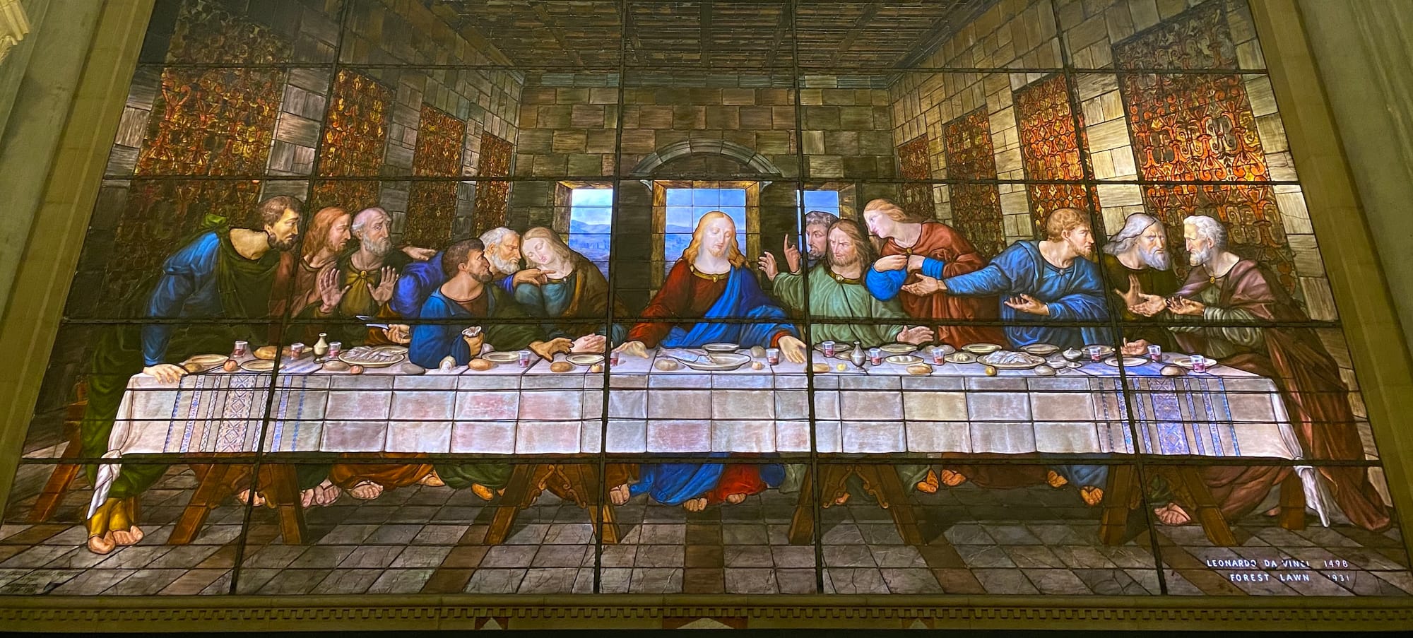 Several times he traveled to Europe and commissioned works inspired by Renaissance masters, including Leonardo's “The Last Supper,” which was recreated in stained glass for greater effect. A photograph shows the two sisters, Rosa and Cecilia Moretti Caselli, who worked on the project in their studio in Perugia, Italy. As mentioned, a replica of Michelangelo's David is also here, and a photo shows the sculpture lying in pieces after an earthquake. Instead of replacing him with another marble sculpture, this time Forest Lawn decided to do it in bronze — and the sculpture was recently re-installed in the Court of David down the hill from the museum, surrounded by a columbarium wall ready for future occupancy.