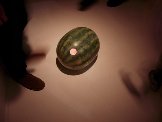 The Bottom series are highly suggestively folded and tied foam atop formica rolls held together by bungee cords. Are these DIY BDSM sex toys? Is this how prison inmates have sex? Thinking and researching what these objects could be I just fell into an awkward internet black-hole of DIY sex toys trying to find if these foam sex dolls were part of some larger sex community that I was unaware of. Turns out people have mastered many techniques with various names like Foo Foo or Fifi, which unlike the Bottom pieces, often involve lubricant and latex gloves with a tightly bound soft object. Coupled with another of his works on display, the suggestive “Untitled (Watermelon),” the two Bottom pieces speak to how unstoppable young men’s sex drives can be, resorting to DIY crafts to satiate their urges if need be.