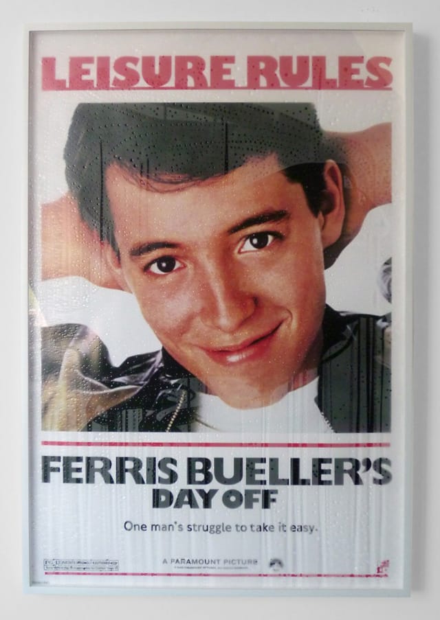 Ferris Bueller’s Day Off, an iconic and hilarious coming of age movie that most of my generation holds quite dear, was the subject of one of my favorite works of the show. Many of us were molded by these characters and stories more than any museum or artworks, so it makes sense to find them now featured in galleries. Ferris Bueller in”Leisure Rules” looks like he is steaming up his own frame, and at first I thought there was actual water inside the frames. Actually, this faux-steamy movie poster is meticulously crafted from a frosting spray to recreate steam, and uses droplets of resin as condensation.