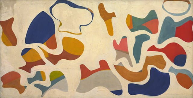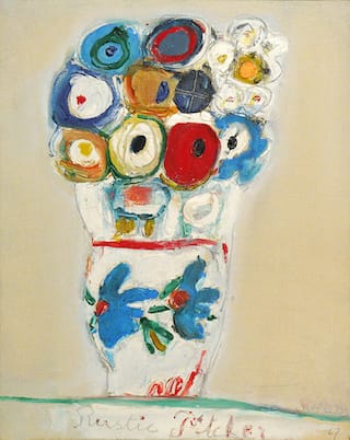 The simplicity of a piece such as “Rustic Pitcher” (1967) is exceptionally compelling, even in an exhibition filled with casually spare pictures (which allow for a packed installation that never feels crowded). A monolithic fusion of vase and flowers, with the latter stacked in a grid of enamel-hard, multicolored circles, is centered on a blank canvas. The teeming positive shapes boldly set against the vacant negative space releases a palpable tension between unity and incoherence — a paradox of seamless disjunction.