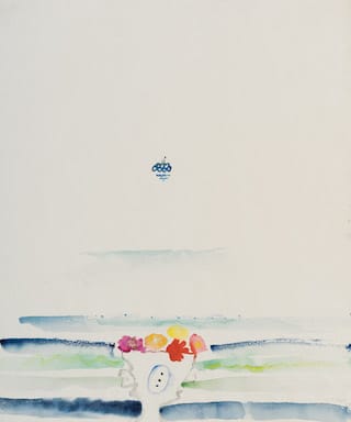 The second painting, a watercolor, is nearly blank. The island is indicated by a cluster of seven tiny blue circles near the dead center of an empty expanse, with the lighthouse springing up like the stem of an apple. There is a single vase of flowers in the middle of the sheet’s bottom edge, with strokes of blue, green and gray fanning out on either side, presumably the waves rolling onto the beach.