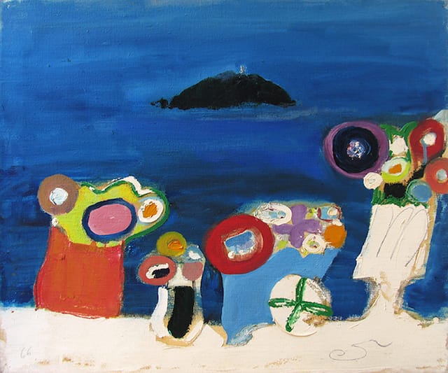 Two paintings, one from 1966 and one from 1970, dealing with the same subject — the Isola del Tino, a chunk of rock capped by an historic lighthouse poking out of the Ligurian Sea — speak to the way Schloss reset the dial with each new work. The earlier picture, in oil on canvas, features a solid blue field bordered along the bottom by four loopy vases of flowers emerging from a swath of sand-colored paint. The island is represented by strokes of black forming a gentle hillock in the middle of the blue field, with a fleck of white denoting the lighthouse.