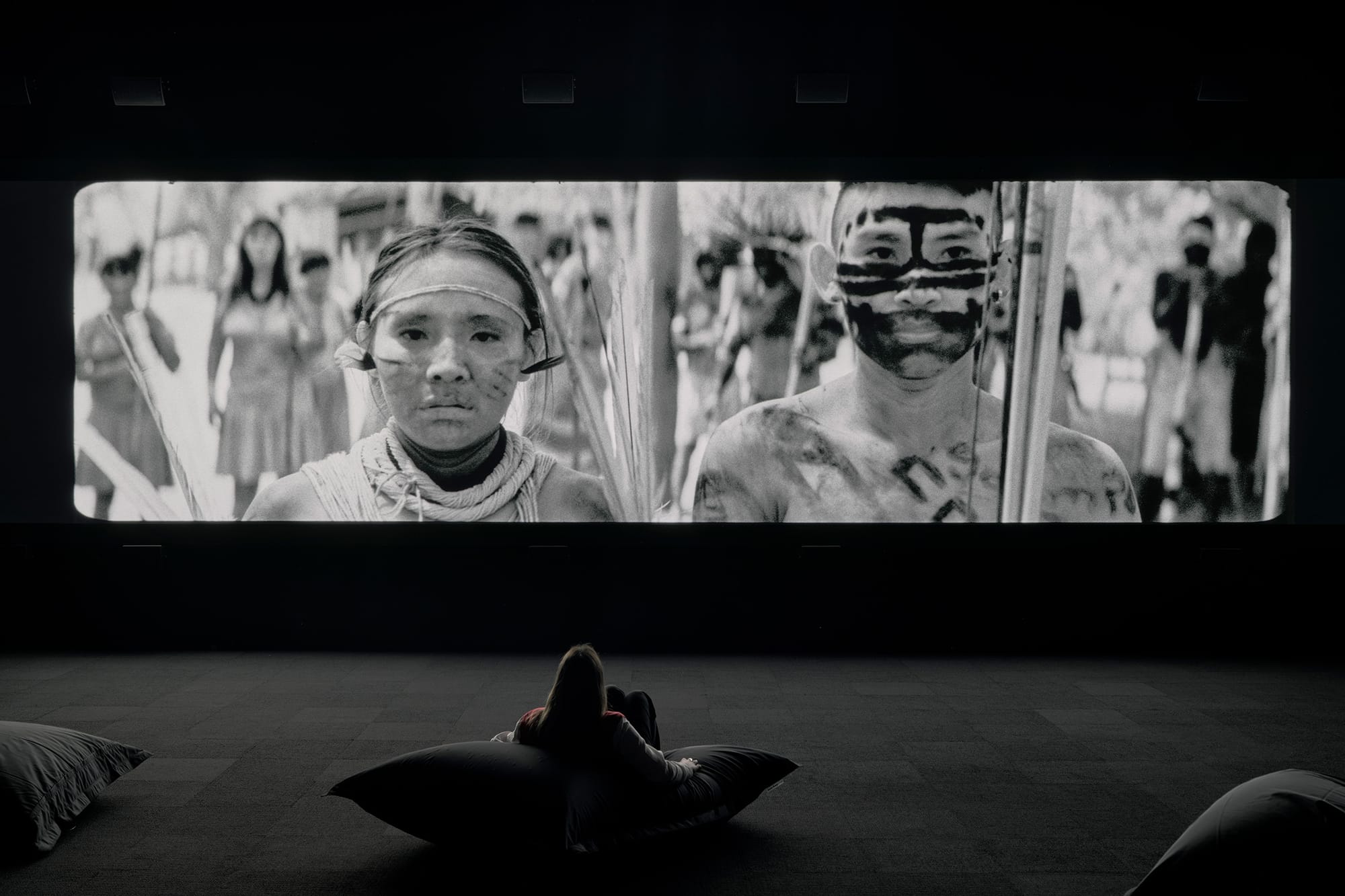 The 74-minute video installation presents black-and-white scenes of slaughterhouses, men burning and cutting down trees, illegal gold mining, and the activism of Indigenous communities affected by these realities. Aerial shots show the vast swaths of the forest that have been cleared.