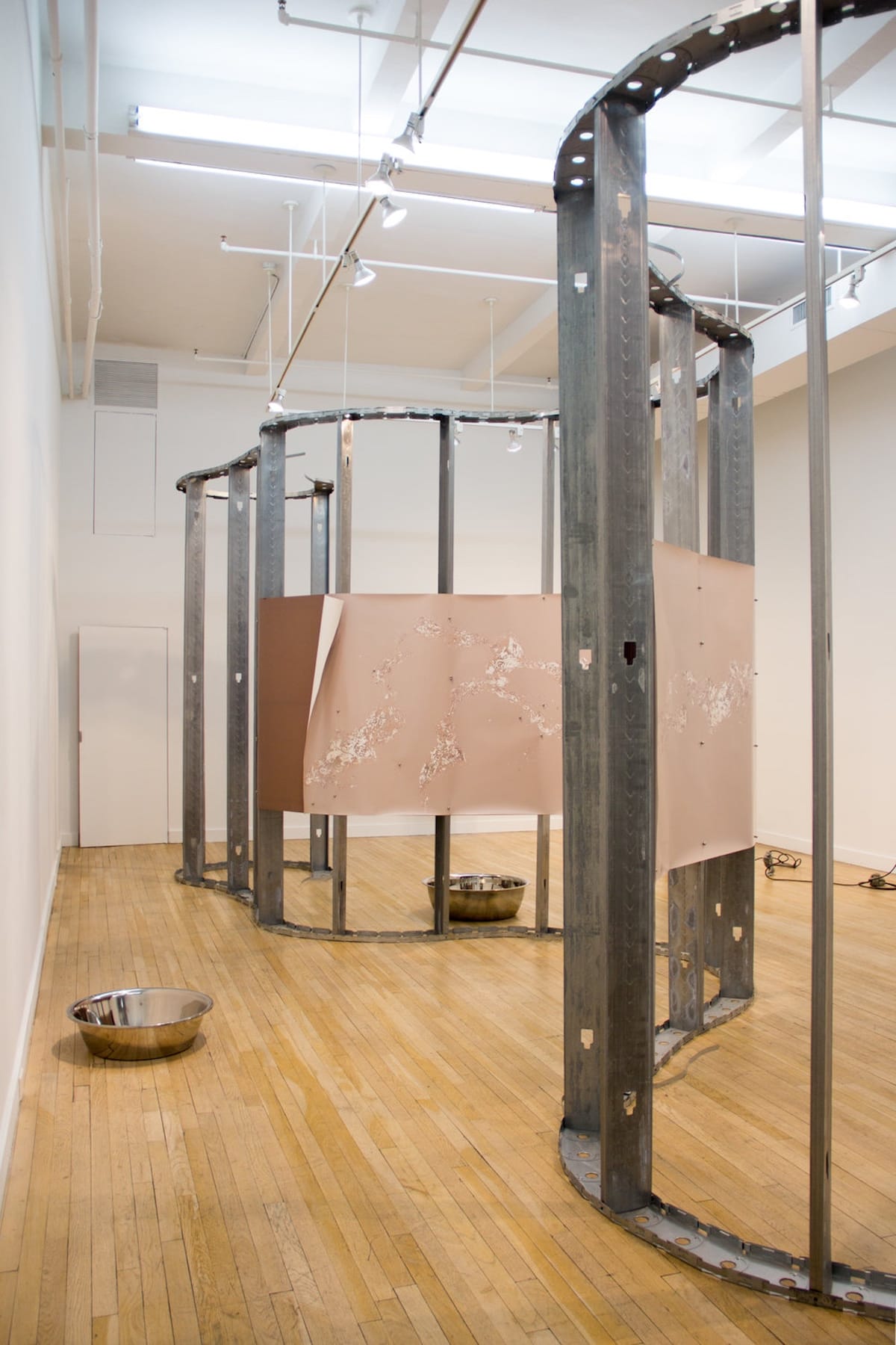 Several large, overlapping sheets of unprocessed and exposed photographic paper in soft shades of mauve are partially wrapped across the work’s midsection, held in place with magnetic balls. These speak to Kang’s background in photography, but the archipelago-like photograms on some of the sheets and the blank surfaces of others can also be read as sculptural fragments or abstract paintings. Or they could be skin grafts on a robotic ribcage. “Involution” checks off the exhibition’s “architecture” formula, while also hinting at the “bodies” ingredient in the way it writhes across the floor with its steely organic reach.