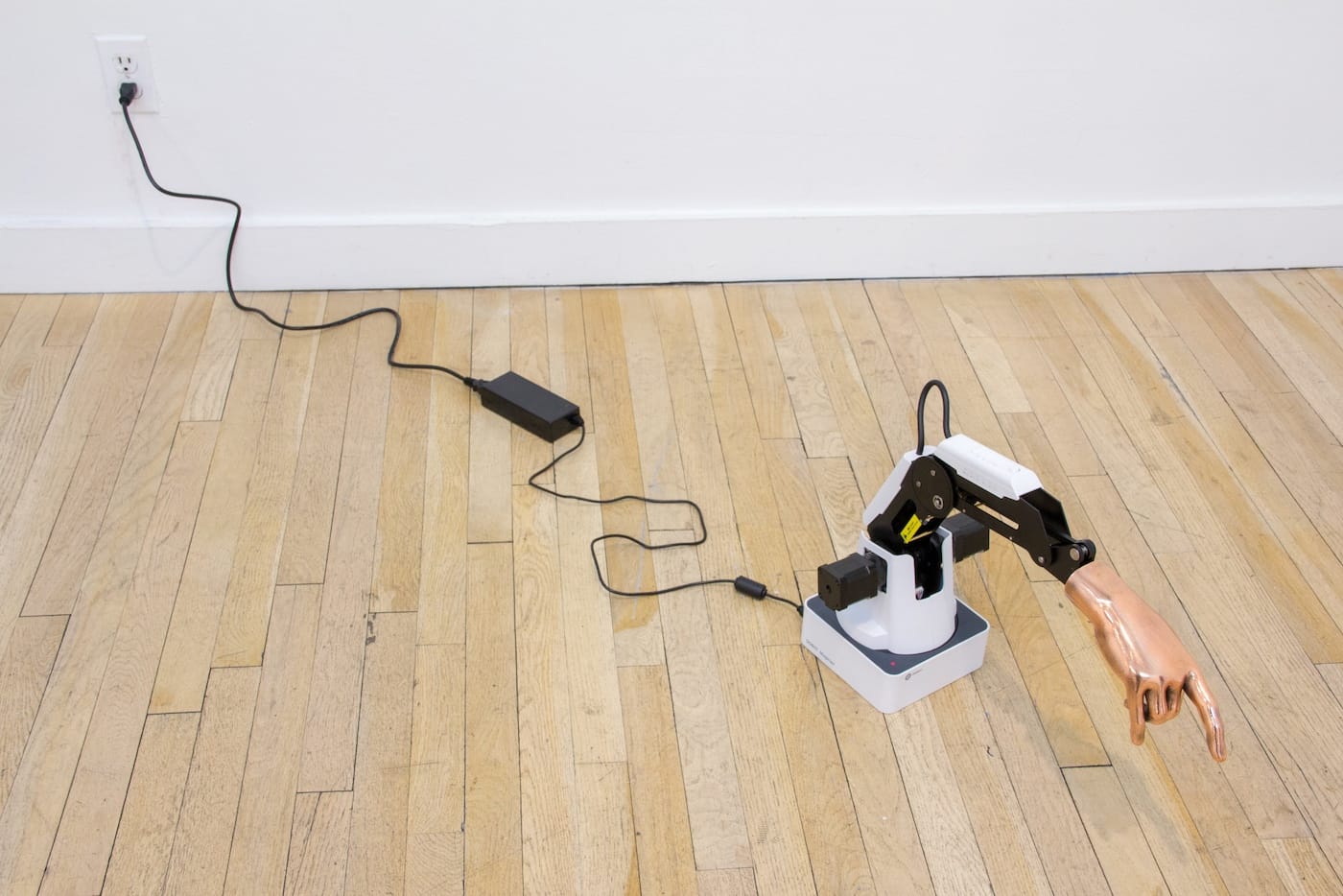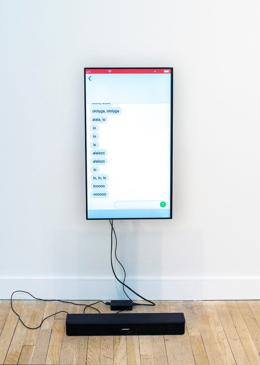 In one corner of the room, a robotic arm with an electroplated hand (based on a classical statue of Calliope, the muse of poetry) taps out messages on an imaginary phone, transmitting the words “ololyga, ololyzo, eleleu, elelizo, alala, alalazo, io” to a vertically oriented LCD screen mounted on a wall near the opposing corner — the “read out” of the piece’s title. What seem like nonsense syllables to the uninitiated are in fact the ululating cries, known as the ololyga, that ancient Greek women would shout during female-centric rituals, hidden from the censorious eyes and ears of men.