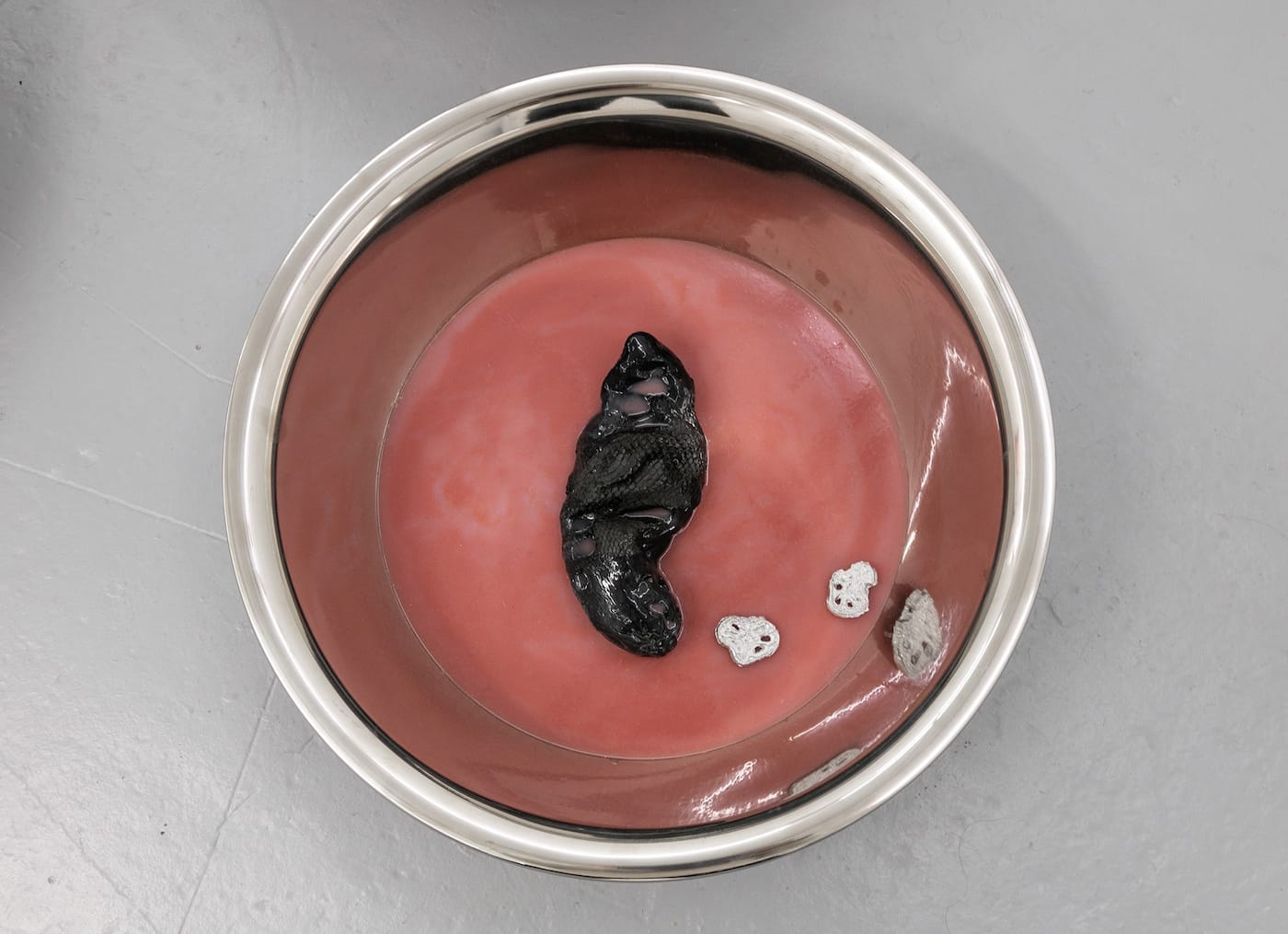 Nestled within the hollow of one of the framework’s bends, “Carrier III,” and its companion piece, “Carrier I” on the other side of the studs (both 2019), relate to “bodies” as well as “goop”: each is composed of stainless steel bowls containing pigmented silicone (creamy white in “Carrier III” and milky pink in “Carrier I”) and lotus roots cast in aluminum. “Carrier I” also holds a polymer cast of a netted fruit bag. Sitting in their viscous soup, the lotus roots and the fruit bag are especially jarring in their resemblance to internal organs or fecal matter vis-à-vis the spotless perfection of their gleaming steel bowls; you expect them to stink, but you’re encountering an illusion.