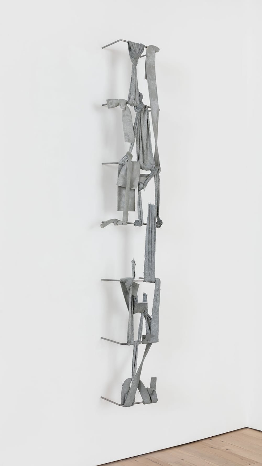 The gray, ladder-like “FIXED LOOP I-II” (2019), apparently named after repetitive audio circuits, climbs the wall on your left as you enter CUE’s 25th Street space. Strips of foam and toweling are tied together from rung to rung, with a couple of gravity-defying loose ends standing straight up when they should be hanging straight down. It’s an elegantly fragmented revival of Analytical Cubism infected with the raffish nonchalance of early Robert Rauschenberg.